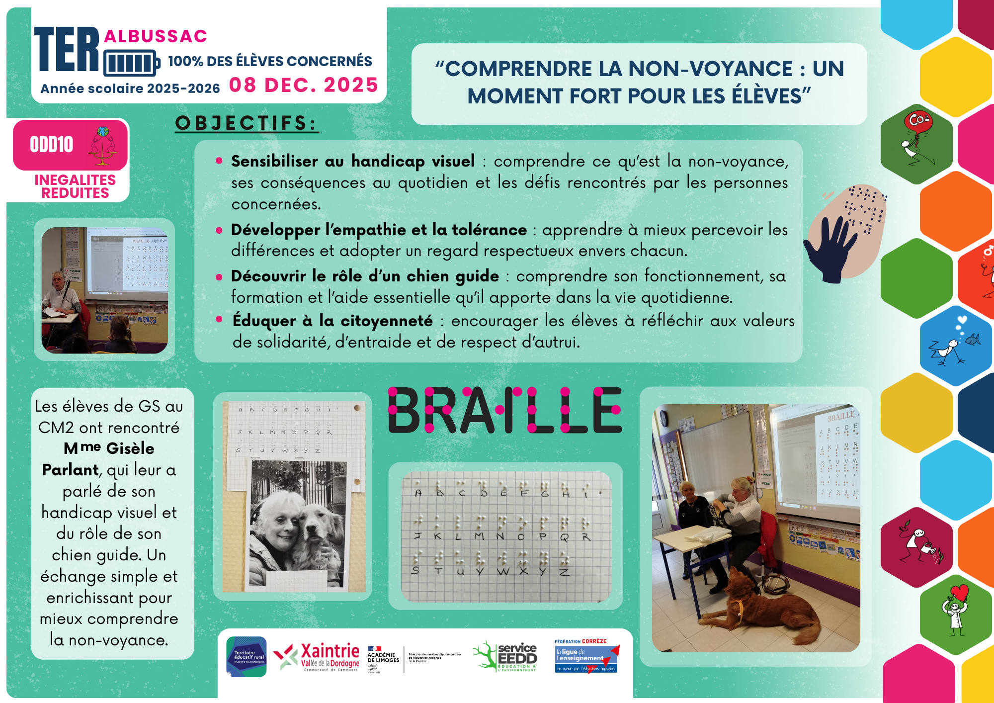 Gisèle, aveugle, est venue présenter son chien guide ainsi que les outils qui lui permettent d’avoir une vie "ordinaire". Les élèves ont appris quelle attitude à adopter face à une personne accompagnée de son chien guide.