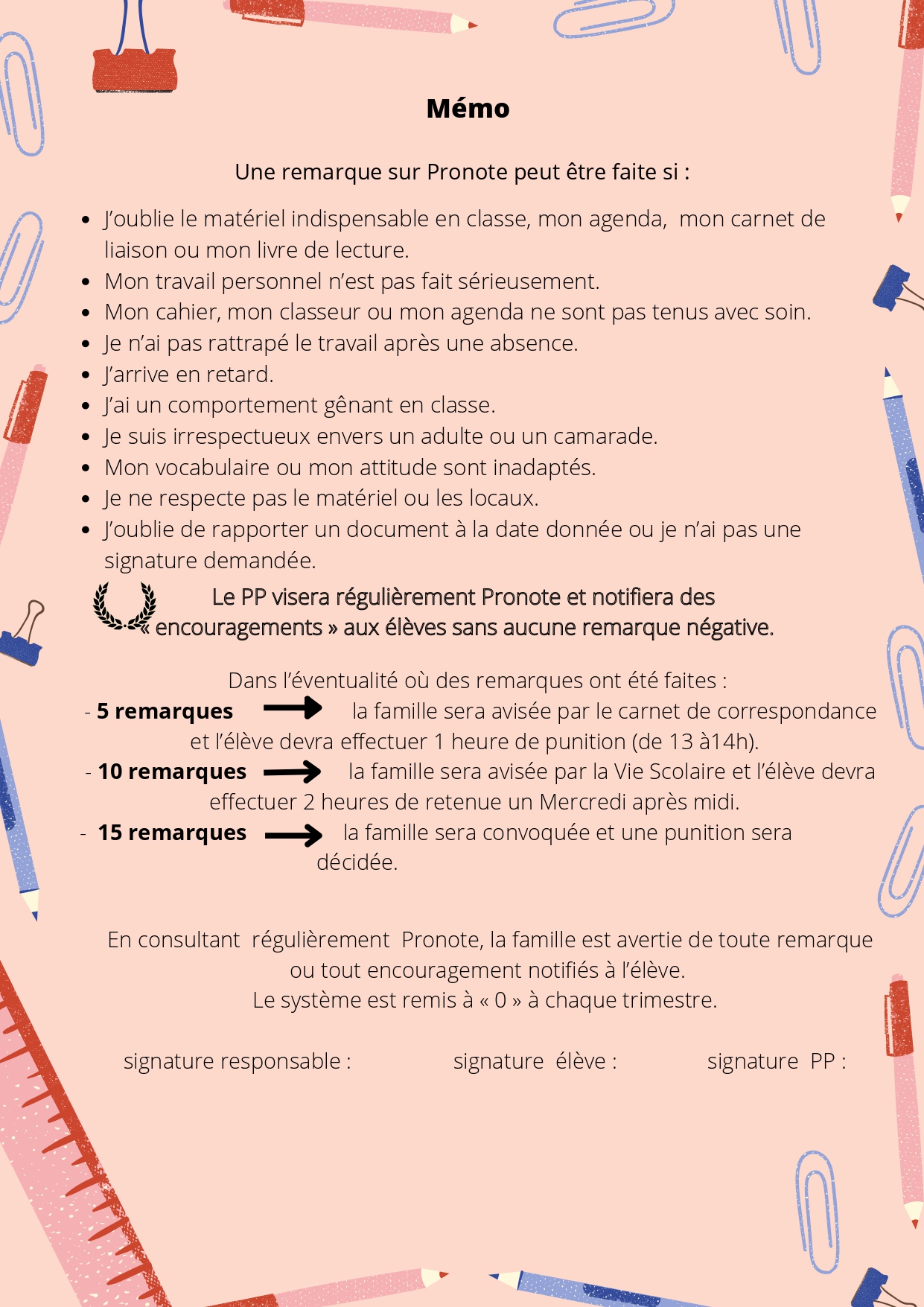 Voici le mémo des remarques PRONOTE