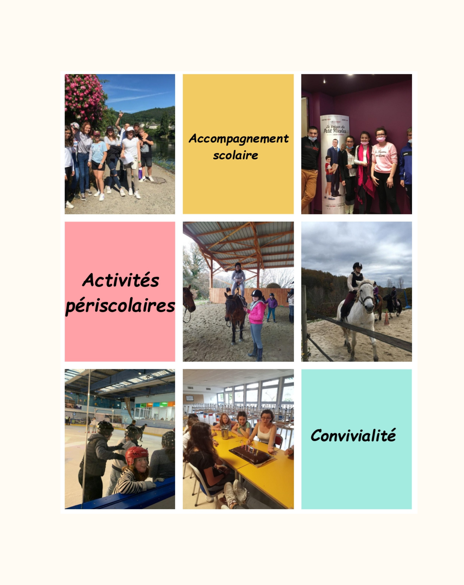 Des sorties sont organisées tout au long de l’année : bowling, spectacles, restaurants, promenade en nature...