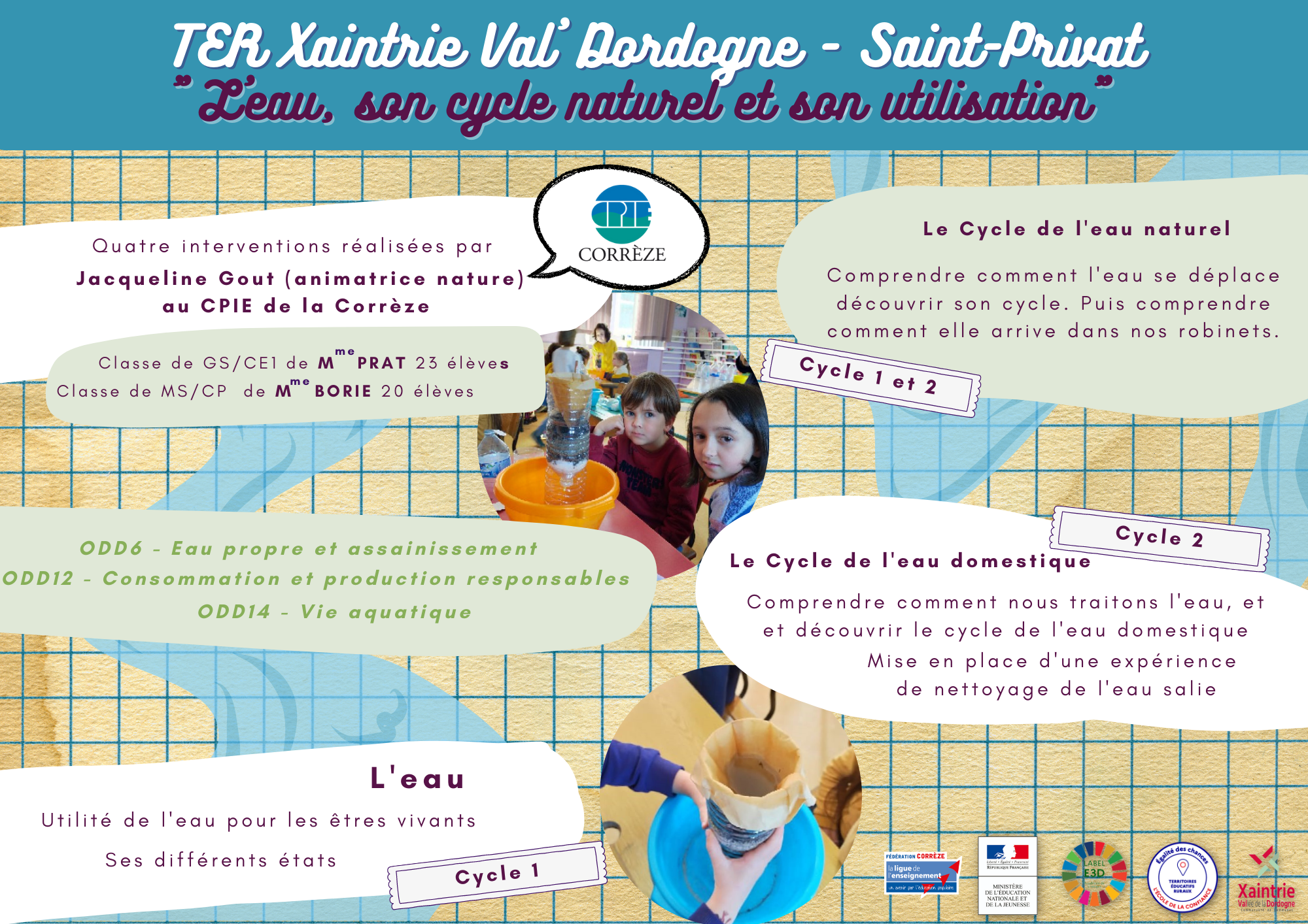 Plusieurs interventions du CPIE se sont déroulées au sein de l’école de St-Privat. Elles ont permis d’approfondir un travail fait par les enseignantes autour du cycle de l’eau.
