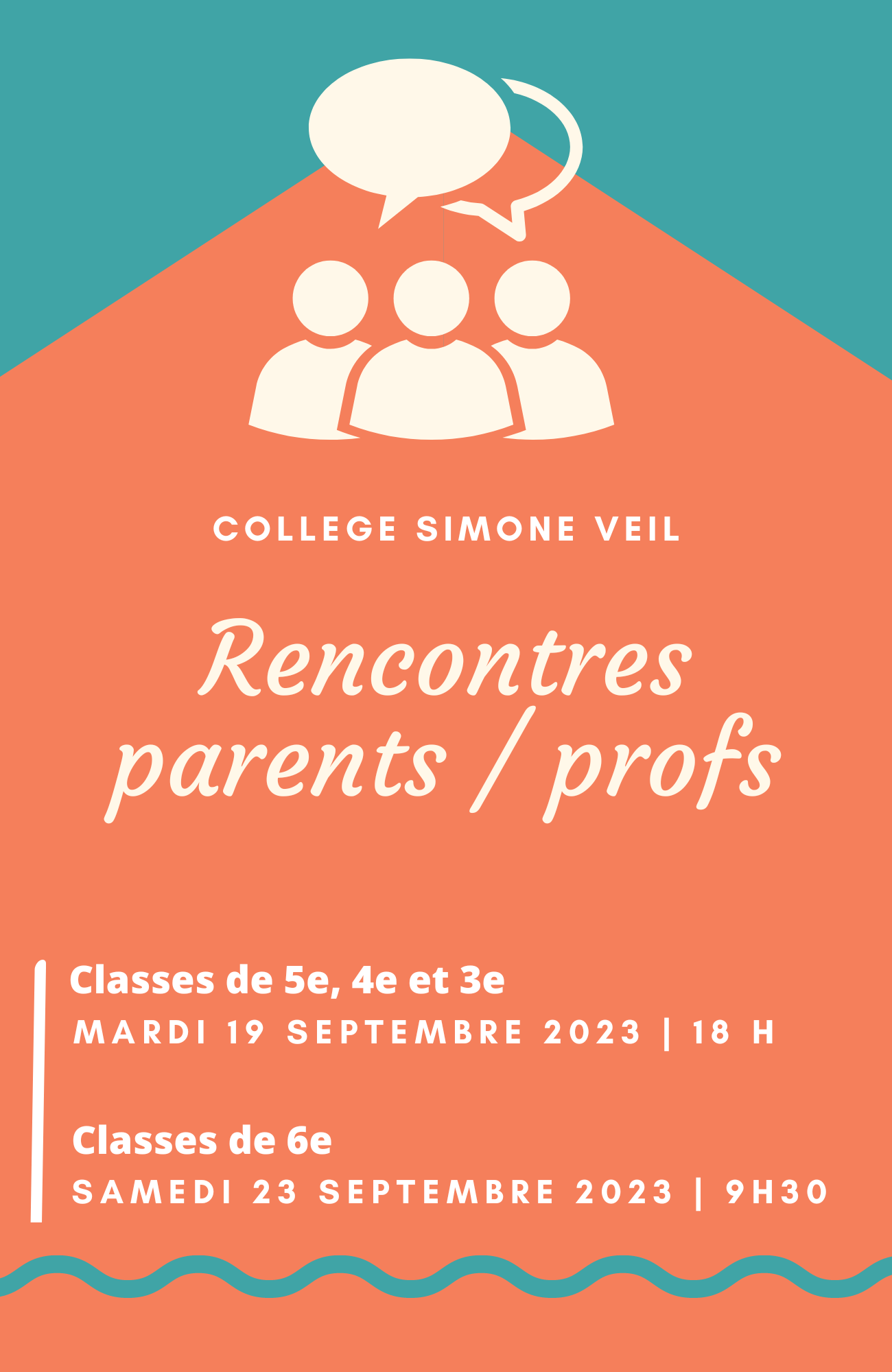Des rencontres parents/profs sont organisées le mardi 19 septembre pour les élèves de 5e, 4e et 3e et le samedi 23 septembre pour les élèves de 6e.