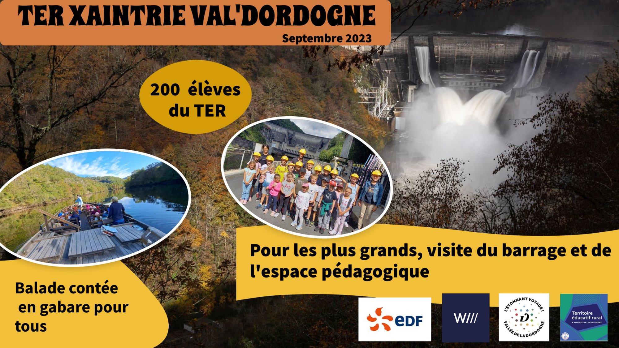 Durant le mois de septembre, plusieurs classes du TER Xaintrie Val’Dordogne ont pu se rendre au bord de la Dordogne pour une superbe balade contée sur la gabare, la visite du barrage du Chastang ( dès le CE2) et son espace pédagogique ( dès la GS).