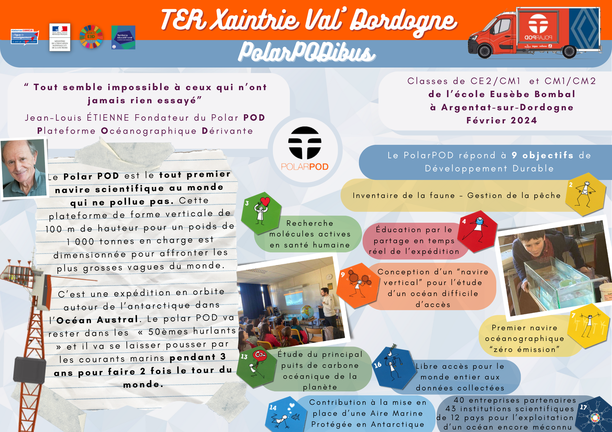 Suite à cette journée, le polarPODibus était présent le jeudi 15 février pour accueillir ces mêmes élèves. Une présentation de l’expédition du navire scientifique polar POD a été faite. C’est une expédition autour de l’océan Austral à bord d’un bateau unique, de forme verticale et non polluant.