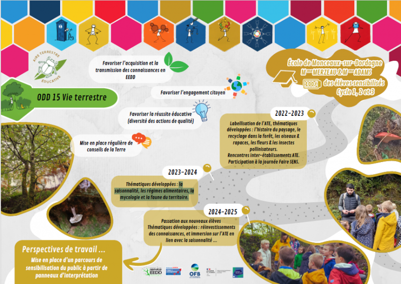 L’ATE de Monceaux a été mise en place en 2022 autour de l’histoire du paysage, le recyclage dans la forêt, les oiseaux & rapaces, les fleurs & les insectes pollinisateurs.