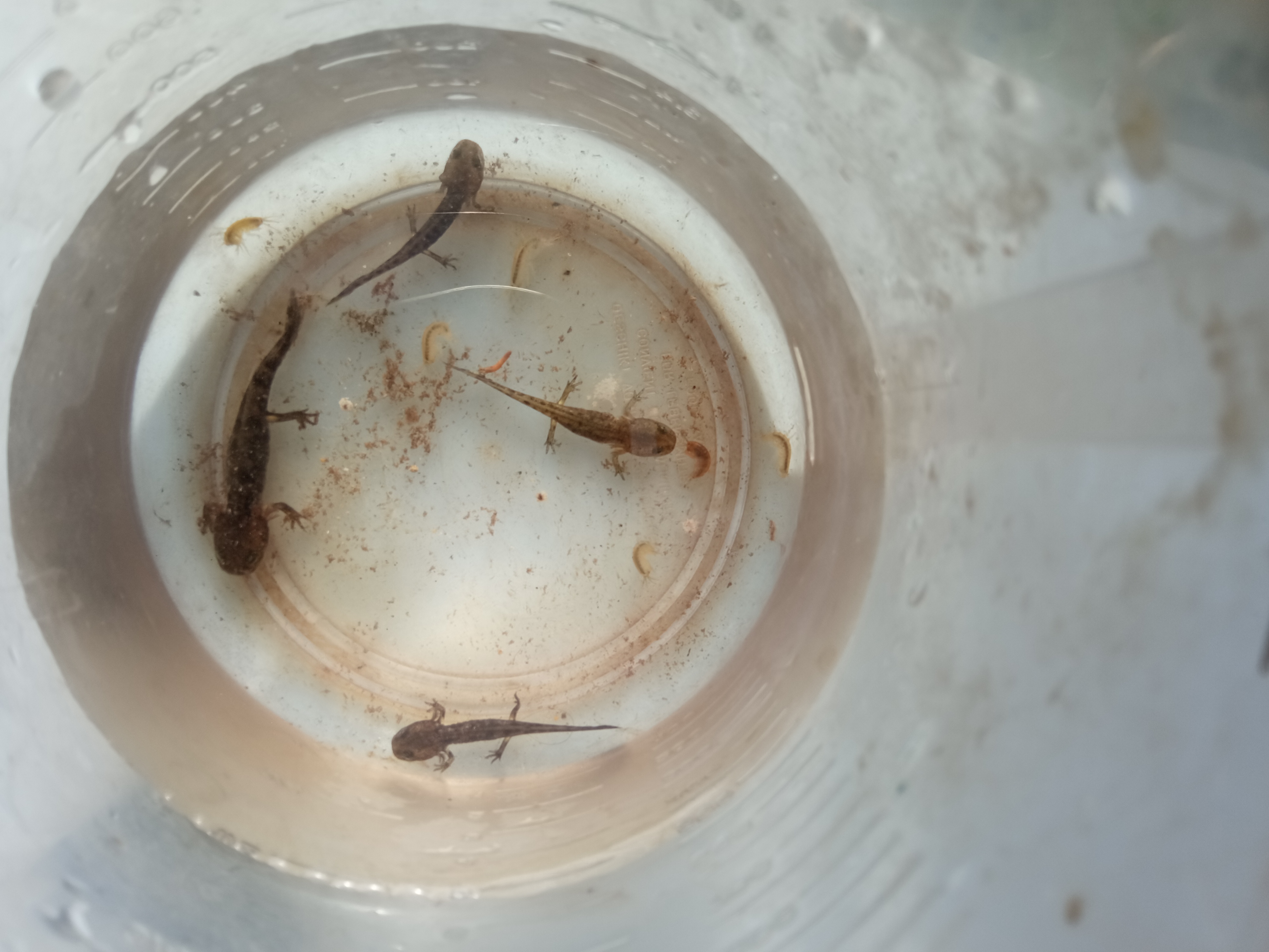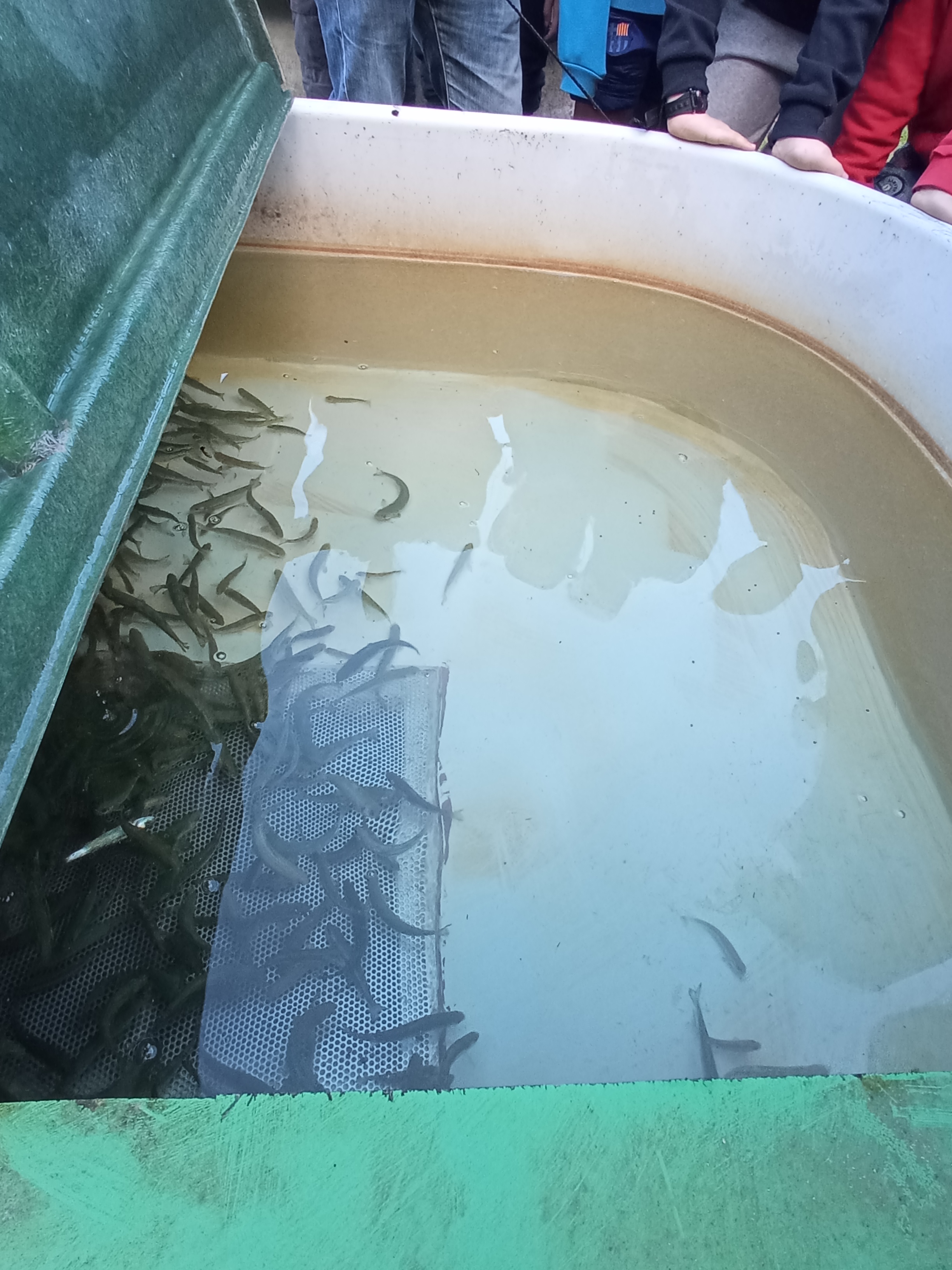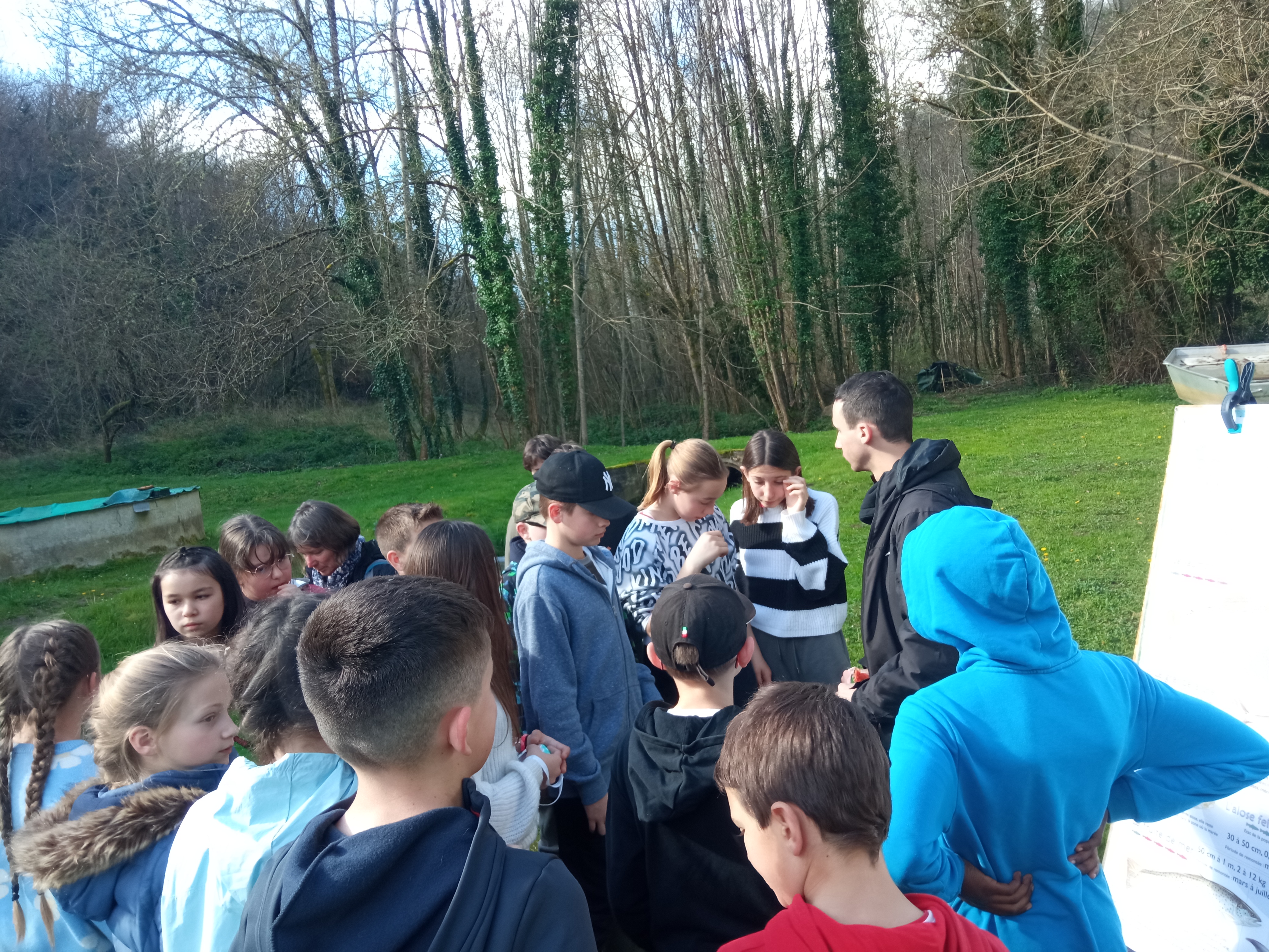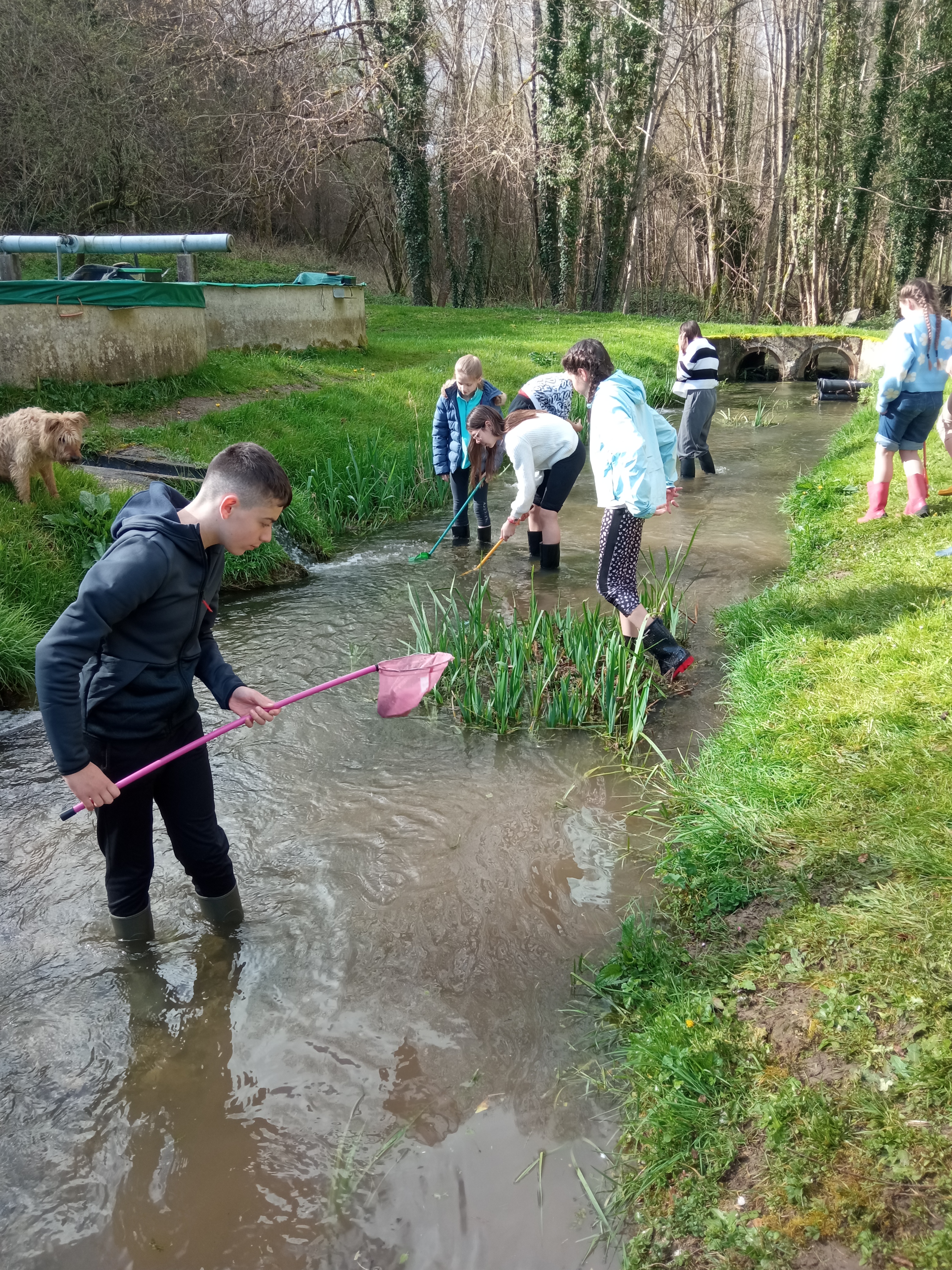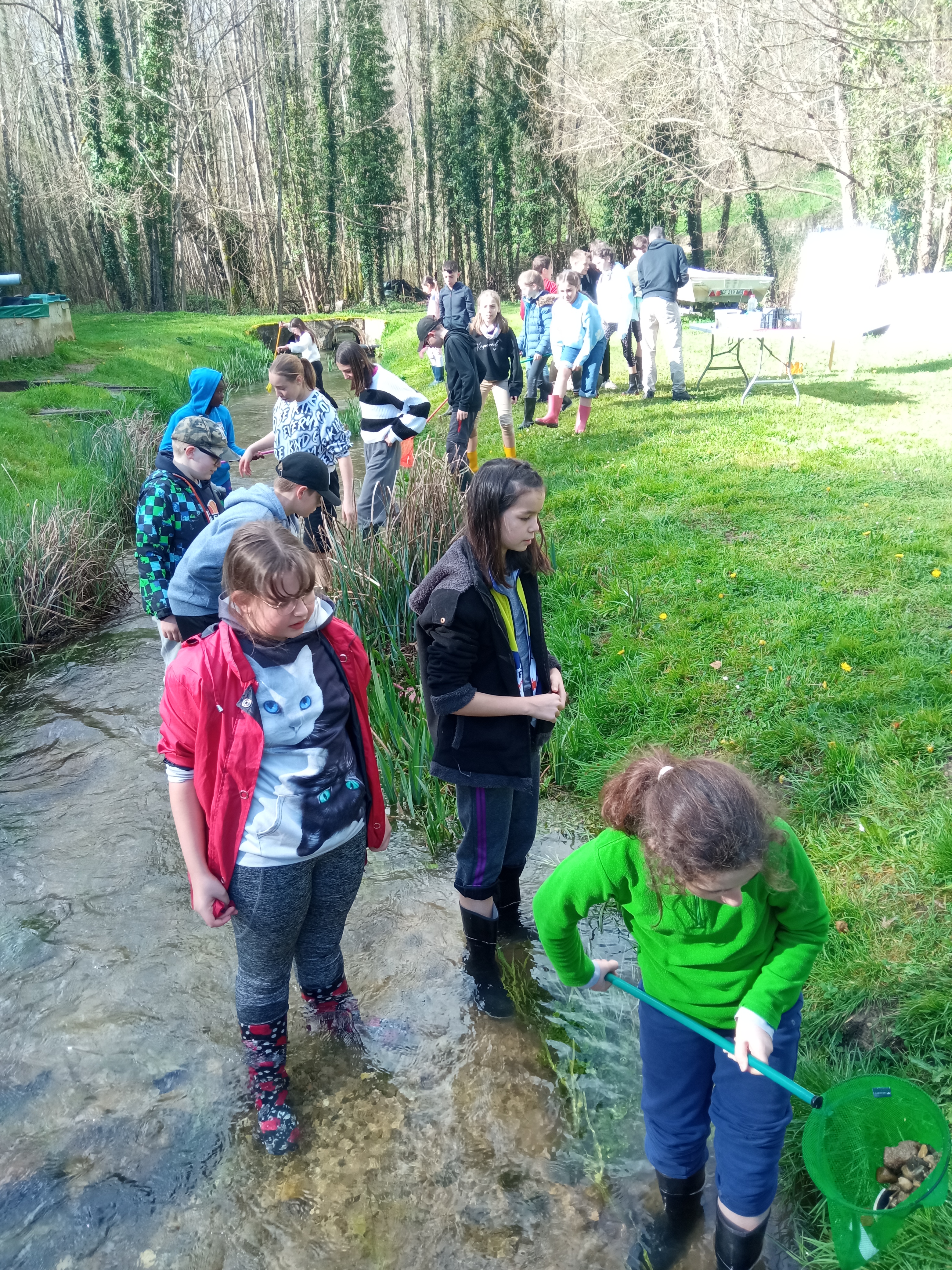La matinée a été consacrée à la visite de la pisciculture dédiée au saumon atlantique pour relâcher des jeunes dans la Dordogne . Les élèves ont découvert les installations et les contraintes inerrantes à cette activité. C’était aussi l’occasion d’observer de près les tacons et les smolts qu’ils ne connaissaient qu’en photos. Les élèves ont également relâché les alevins que nous avions dans notre aquarium en classe dans le ruisseau qui alimente la pisciculture. Ils sont aussi allés à la découverte de la macro-faune aquatique du ruisseau équipés de bottes et d’épuisettes. La pêche a été efficace et une grande diversité de la faune aquatique a été échantillonnée (triton ponctué, larves de libellules, de plécoptères, d’éphémères, de demoiselles, gammares, sangsue, dytique, nèpe, limnée, gerris, larves de salamandre)