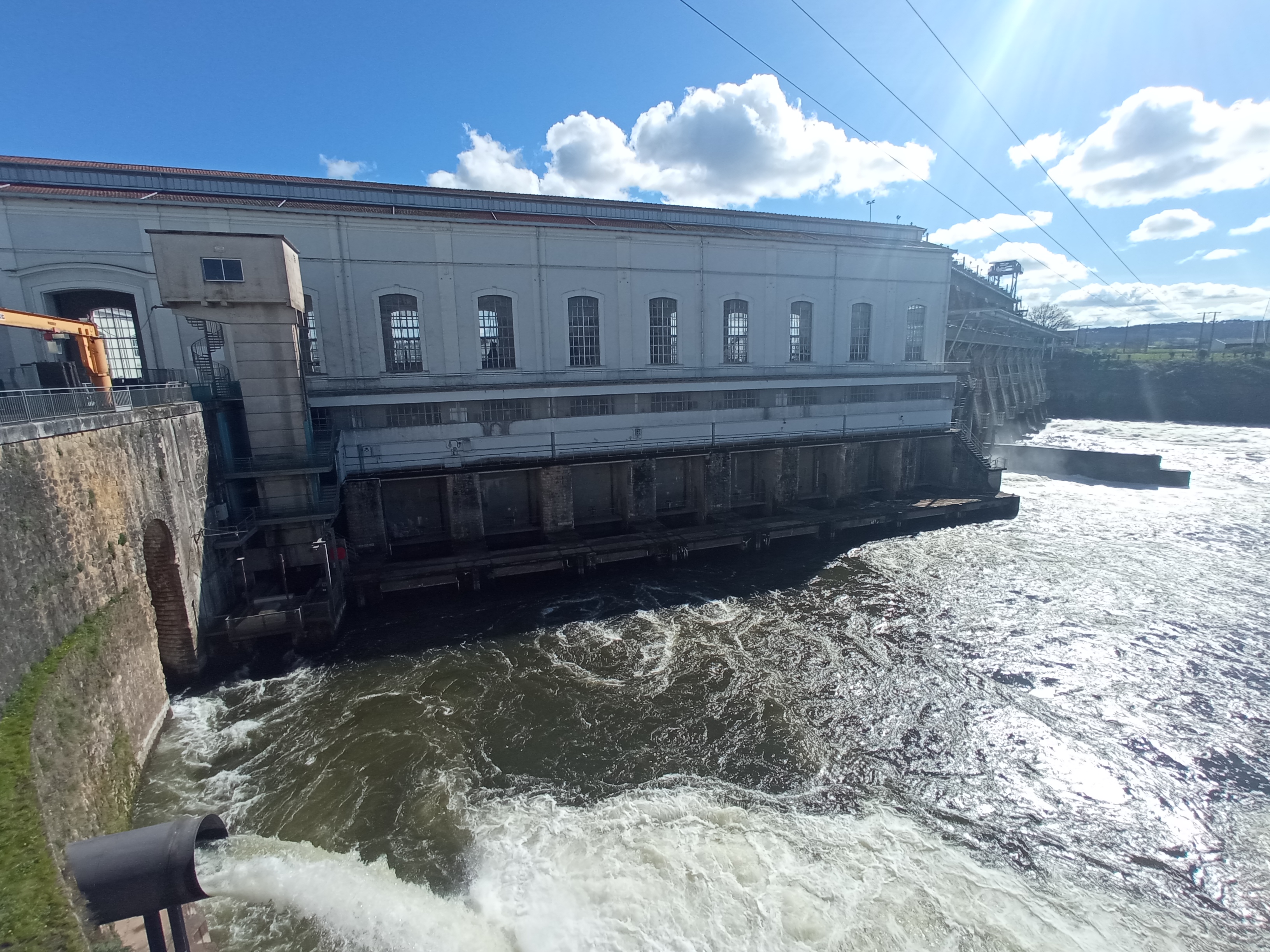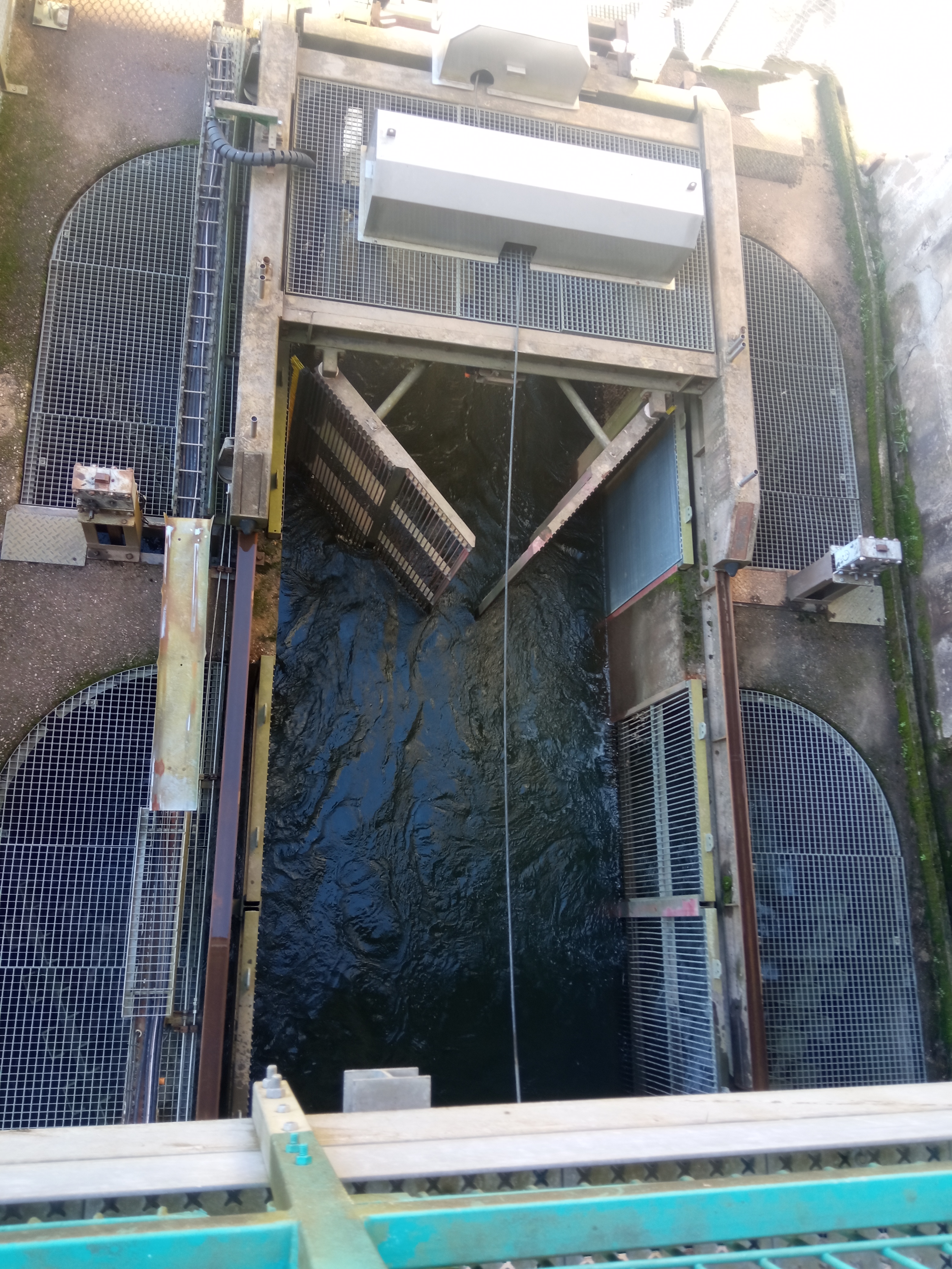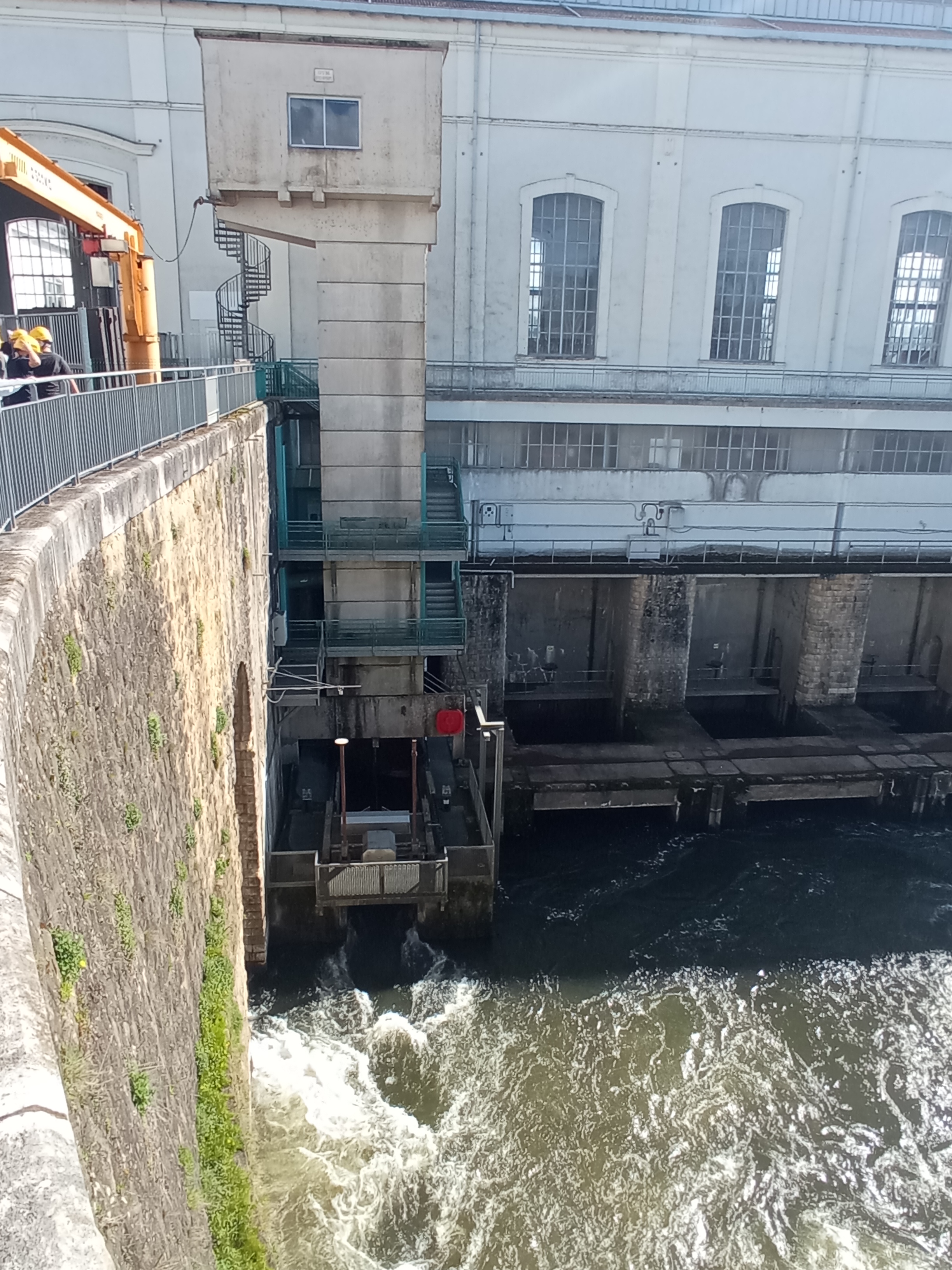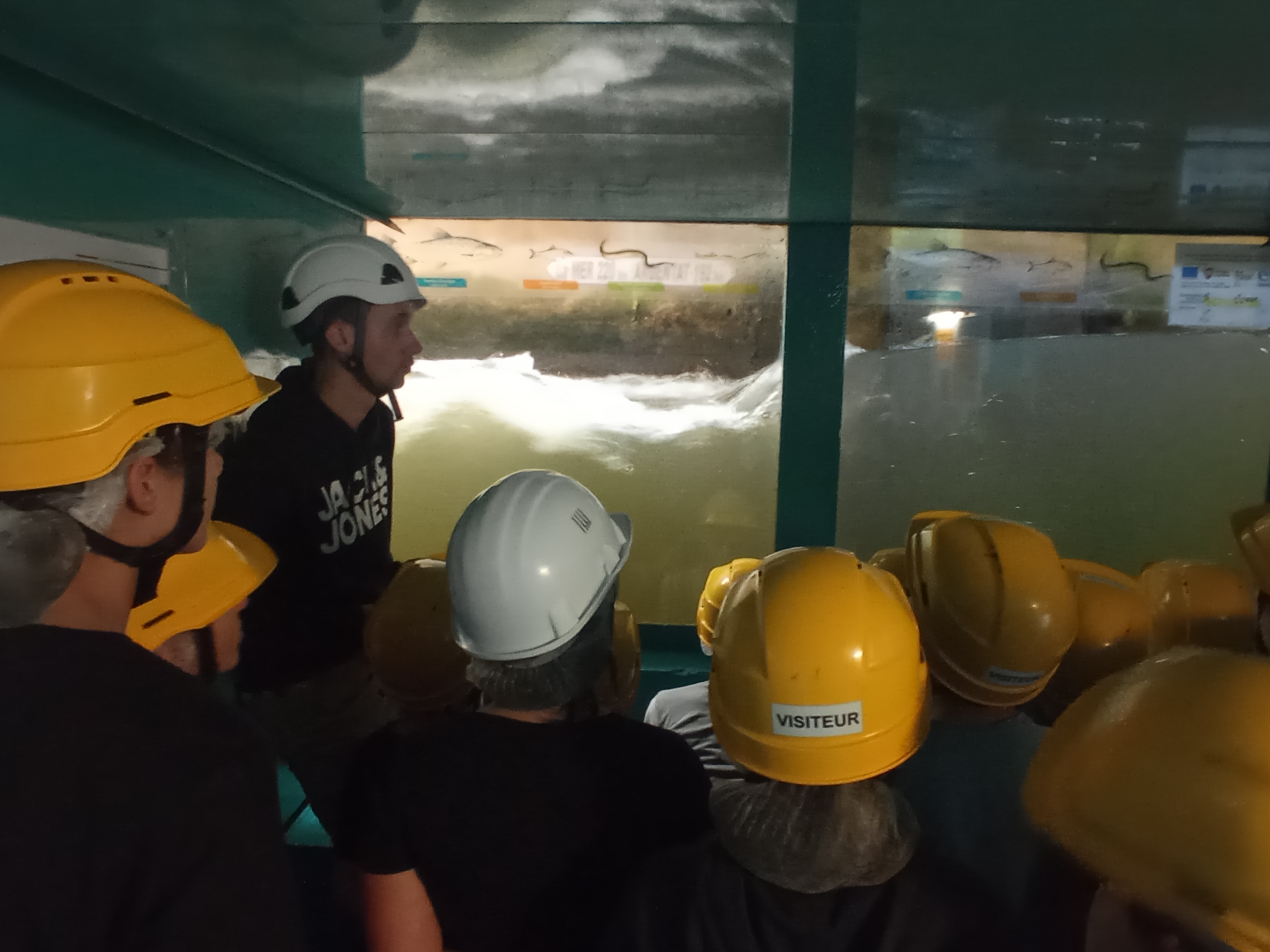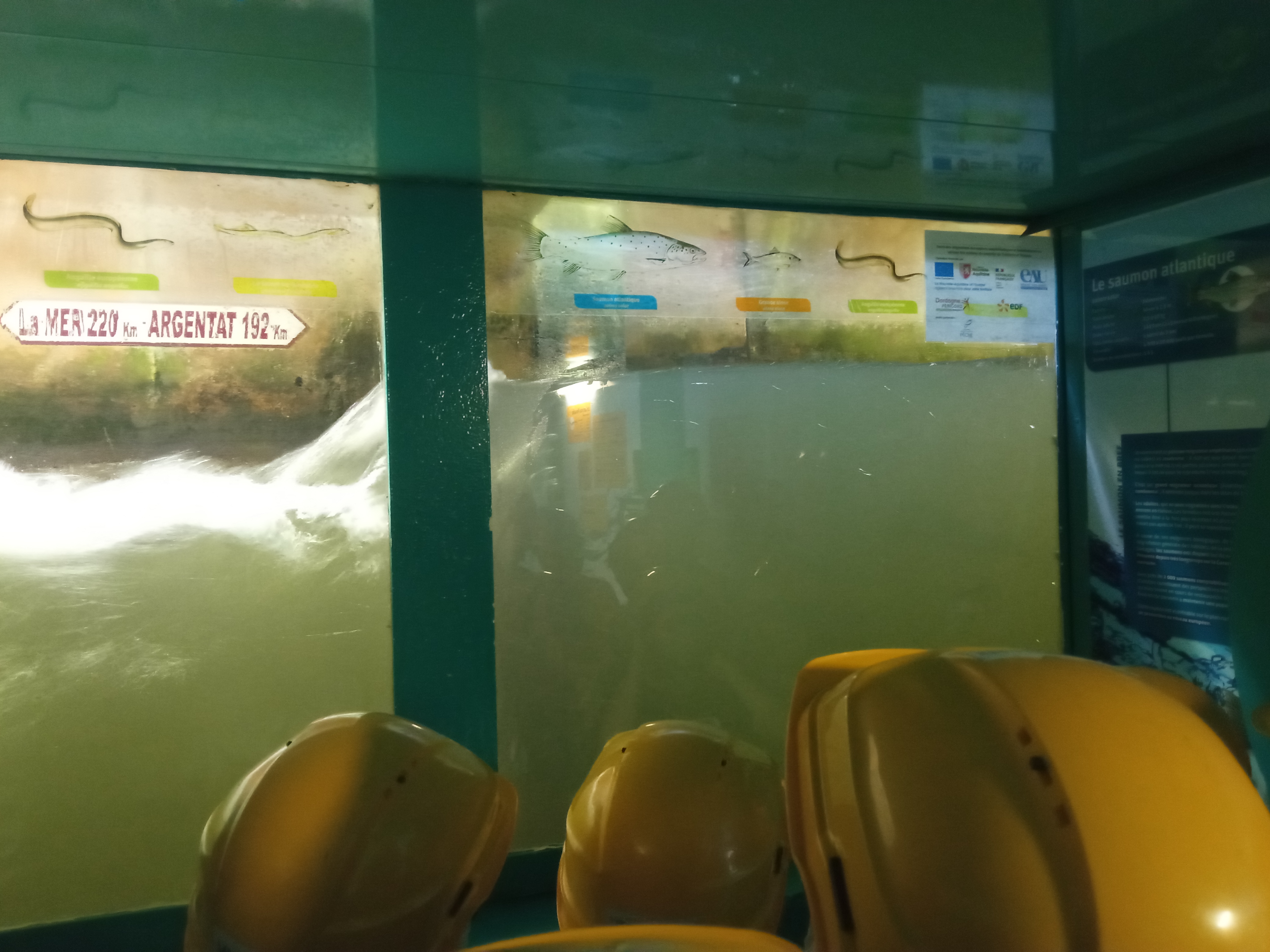 Après un repas sous un agréable soleil printanier, nous nous sommes rendus au barrage de Tuilières pour visiter son installation facilitant le passage des poissons migrateurs. Il s’agit d’une passe à poissons constitué de 13 bassins avec un des rares ascenseur à poisson : une cuve de 3000 L d’eau qui remonte de 10 m et déverse son contenu dans la passe à poisson qui permet aux poissons de franchir les trois derniers mètres de l’ouvrage (haut de 13 m au total). La passe à poisson est dotée d’une vitre d’observation, nous avons pu observer quelques grandes aloses, espèce migratrice comme le saumon atlantique.