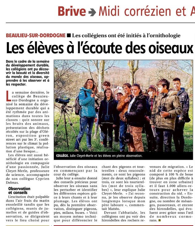 Les élèves de 5e ont bénéficié le jeudi 14 mars 2024 d’une initiation d’1h30 sur l’ornithologie. L’objectif est de découvrir lors d’une sortie quelques espèces d’oiseaux communs de Beaulieu.