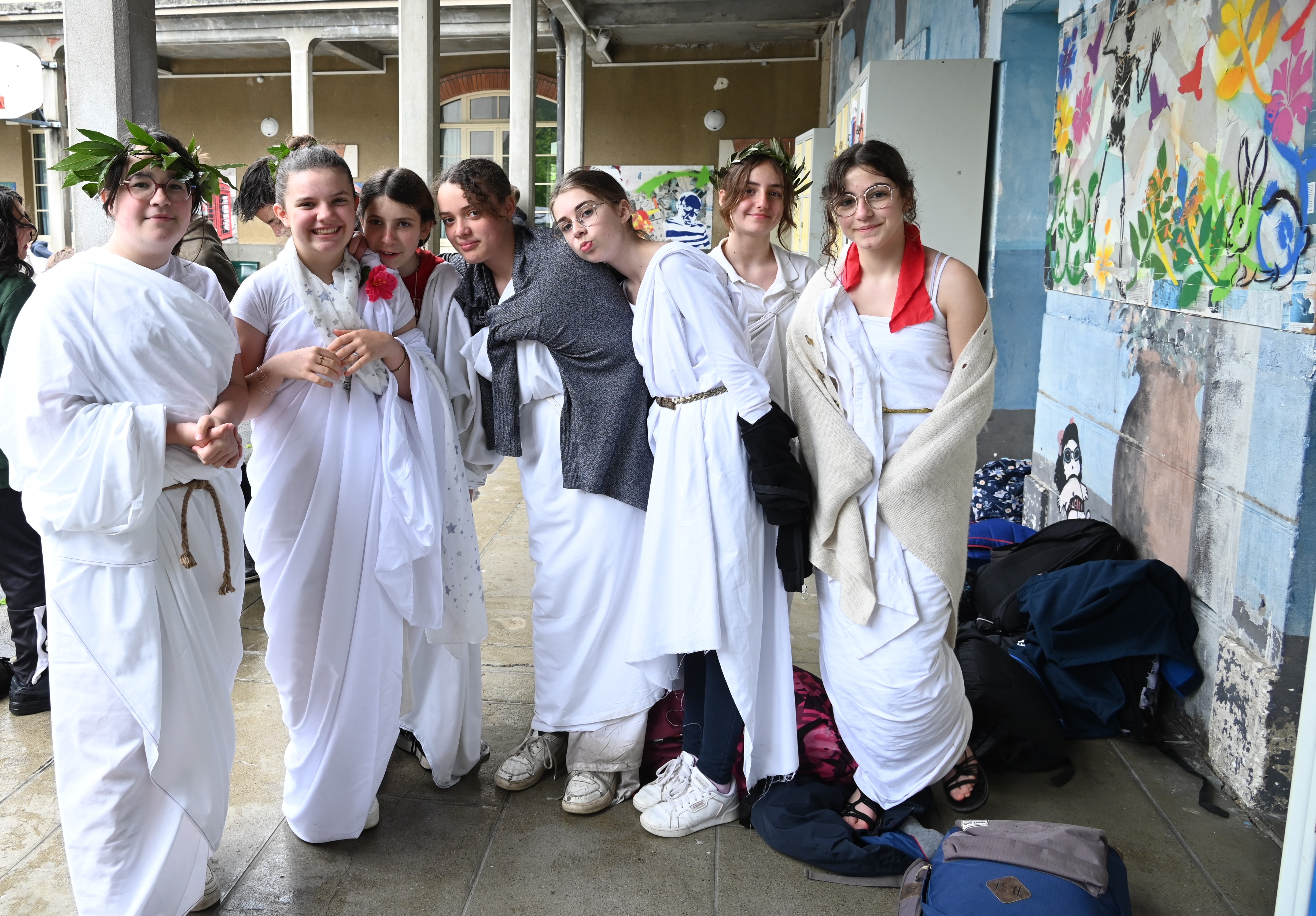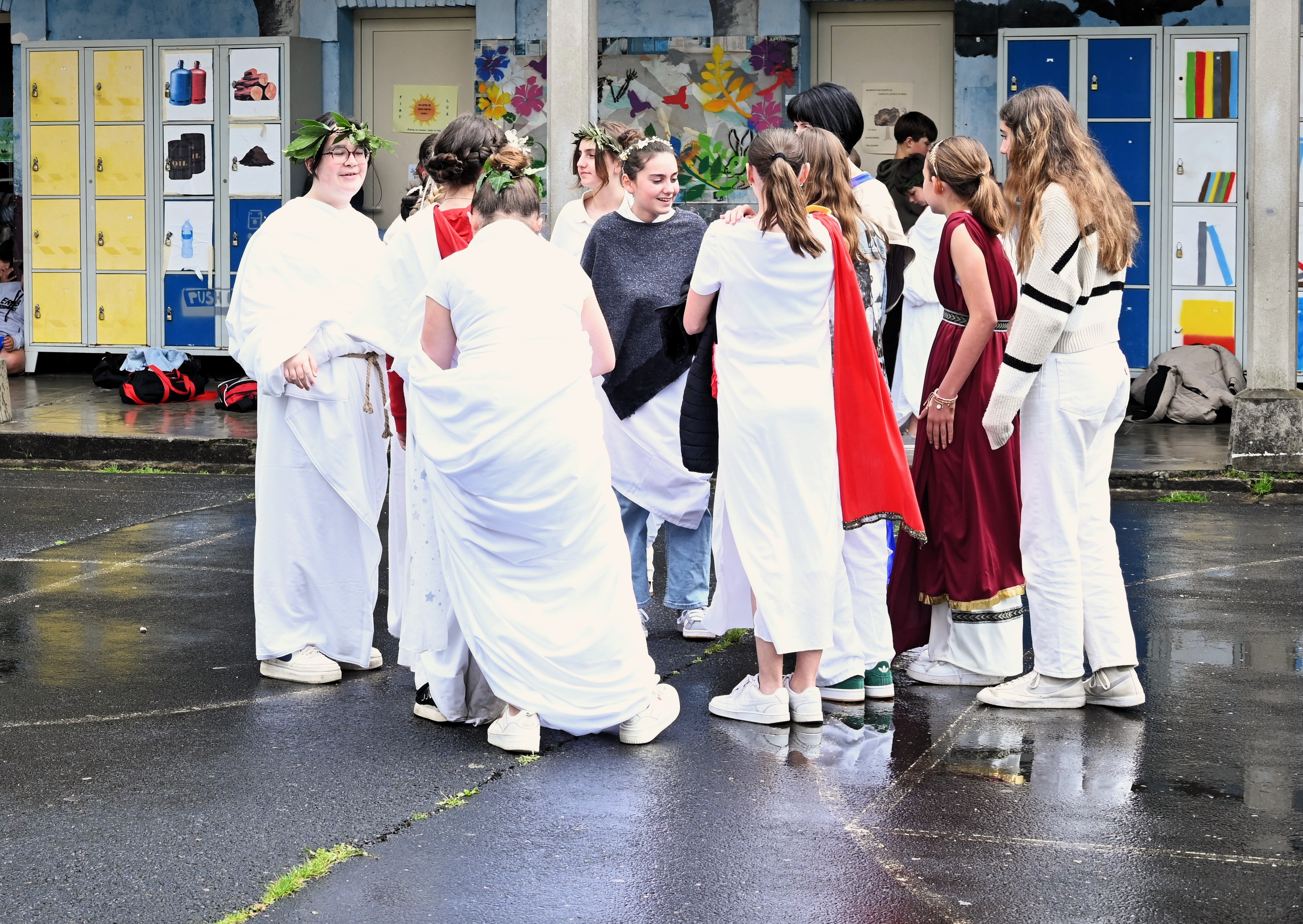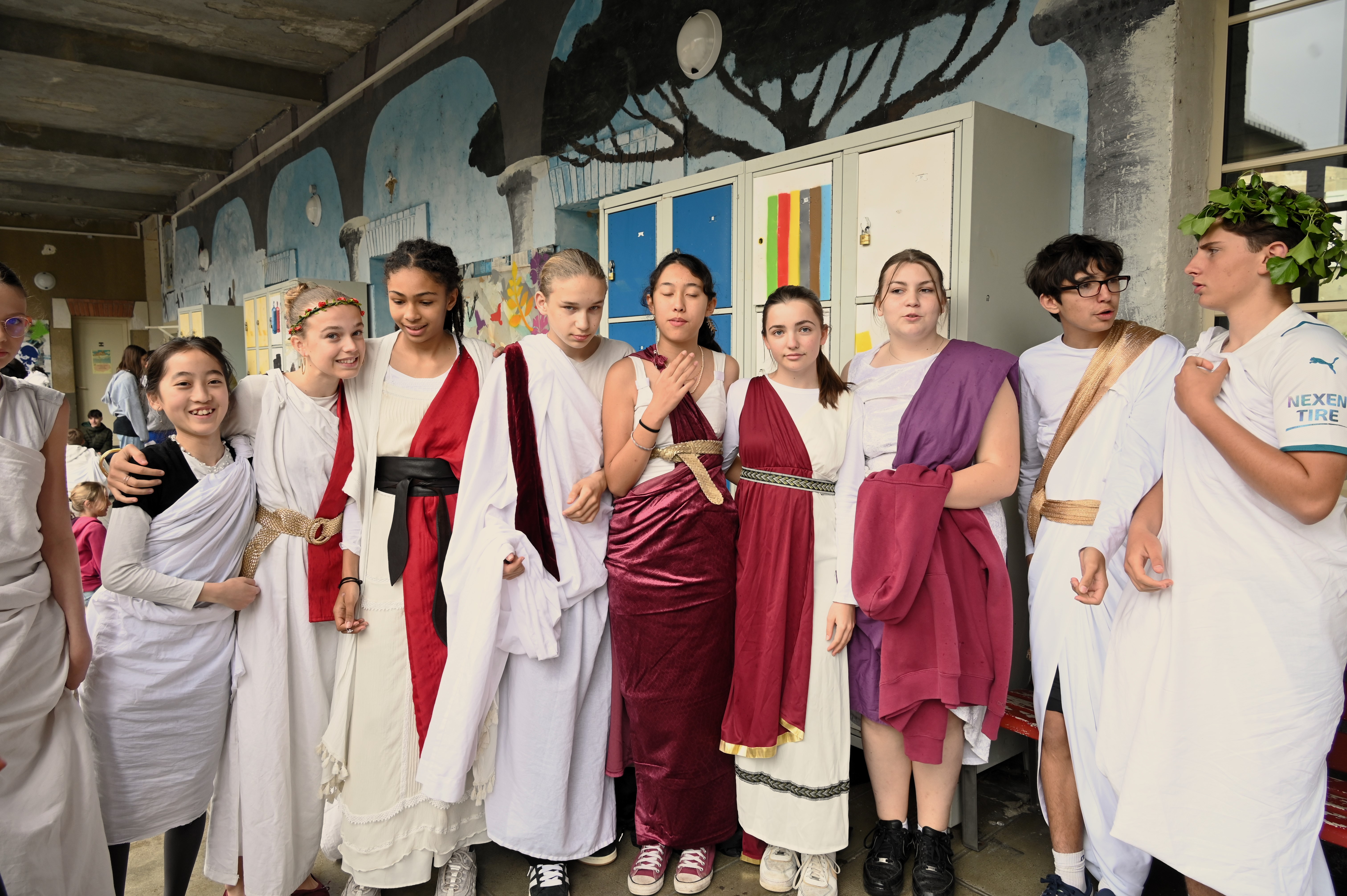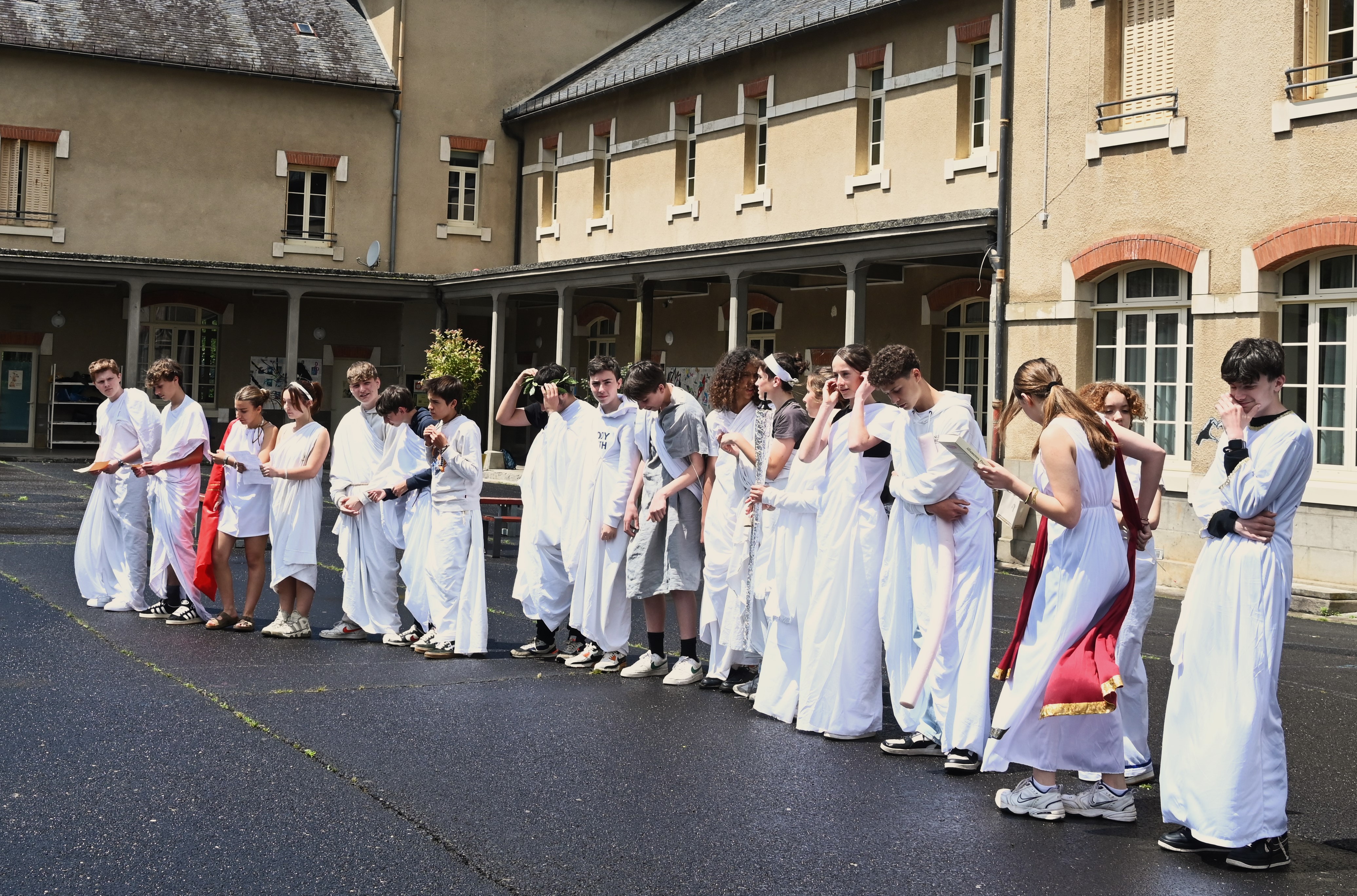 Le jeudi 23 mai, les dieux ont été cléments et ont permis que la « journée toge » ait lieu sous les meilleurs auspices ! Celle-ci a connu trois temps forts : un défilé de mode avec les dernières tendances en matière de tenues antiques, une saynète de théâtre présentée par les 4ème latinistes sur les jeux du cirque , et la réalisation de jeux olympiques bellocois avec une cérémonie d’ouverture en grec ancien, une démonstration d’épreuves antiques et enfin, une course d’athlètes ouverte à tous les collégiens. Devant le succès remporté par cette initiative, il a fallu organiser plusieurs courses, auxquelles ont participé plus de 40 valeureux collégiens, farouches et décidés. Les coureurs victorieux ont reçu naturellement une palme et une couronne d’or.