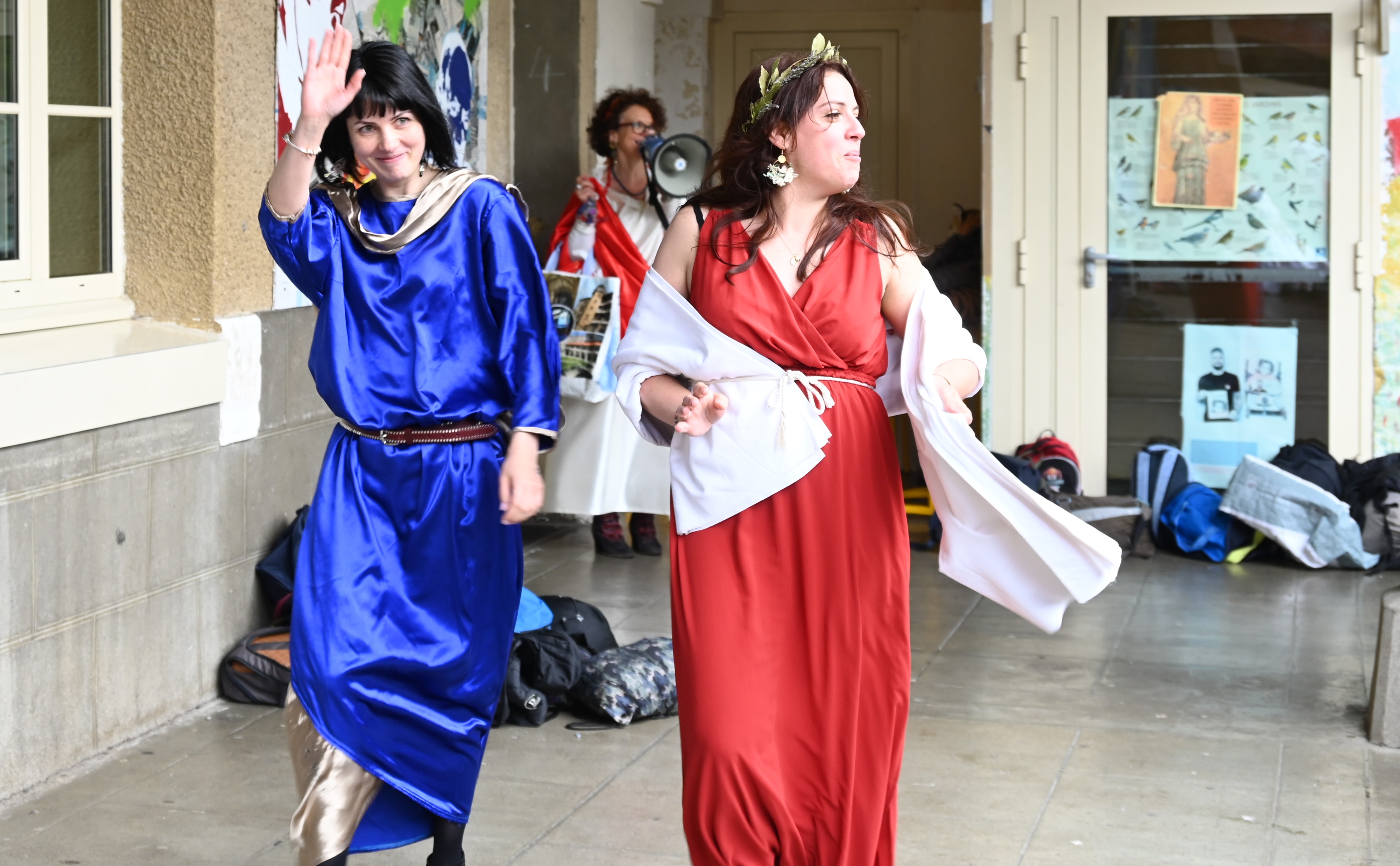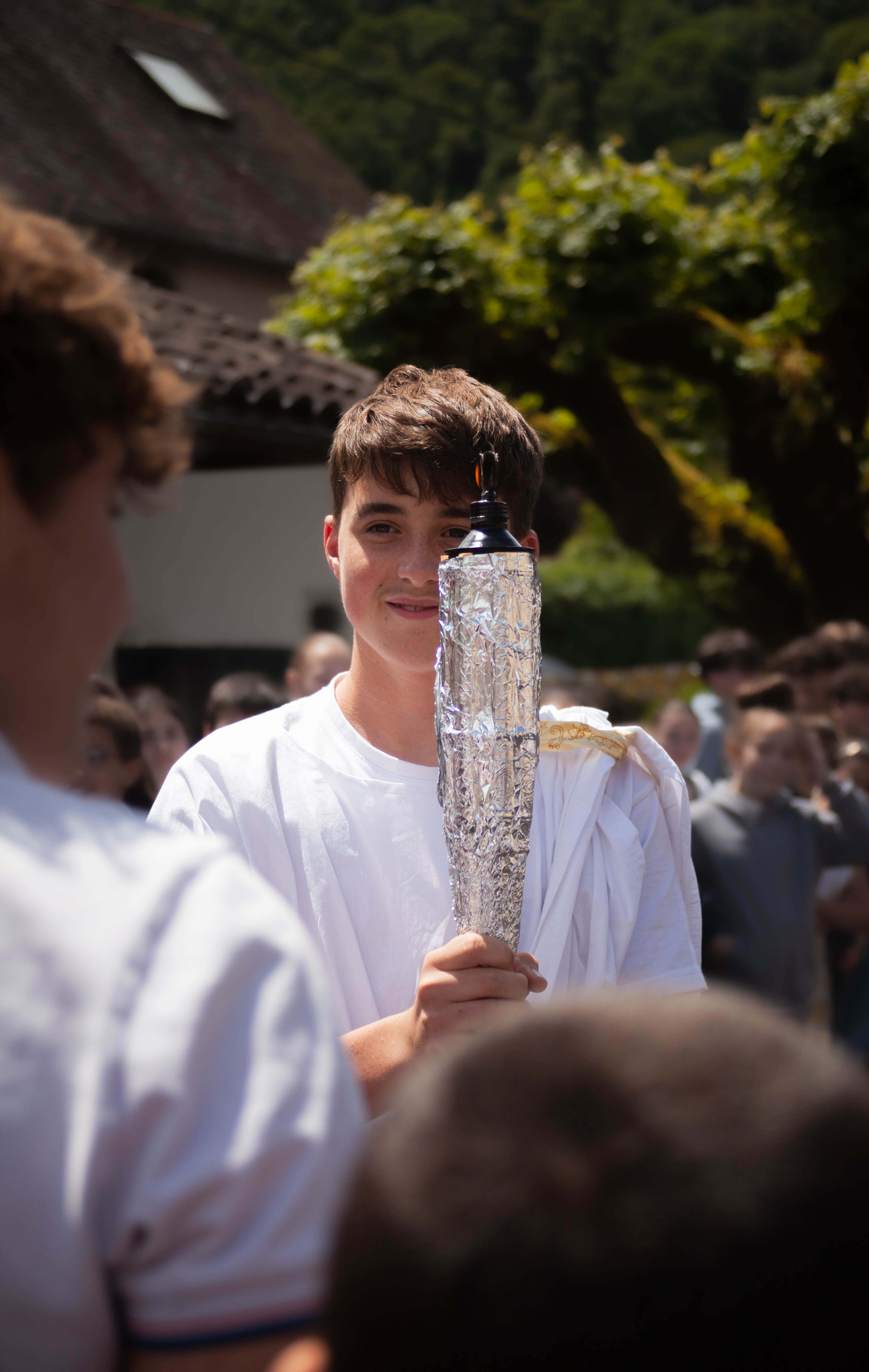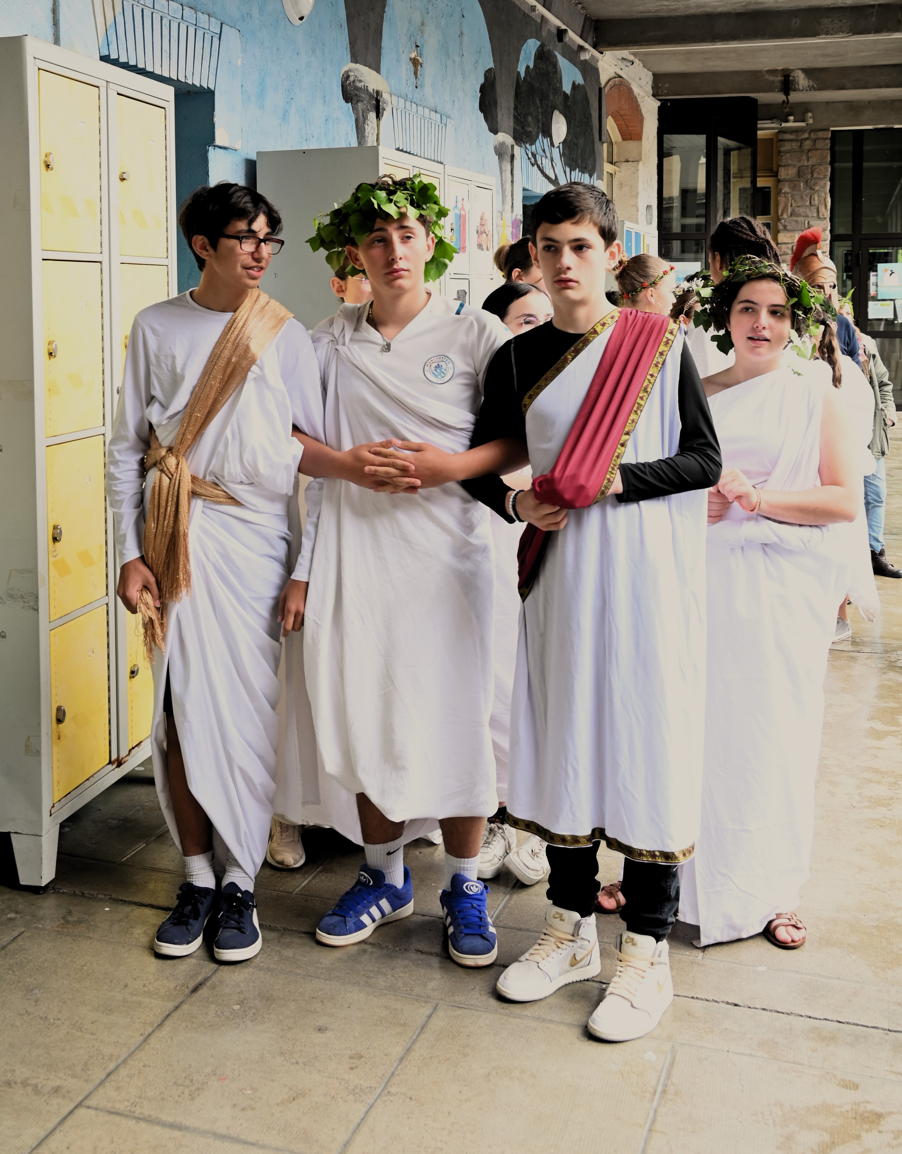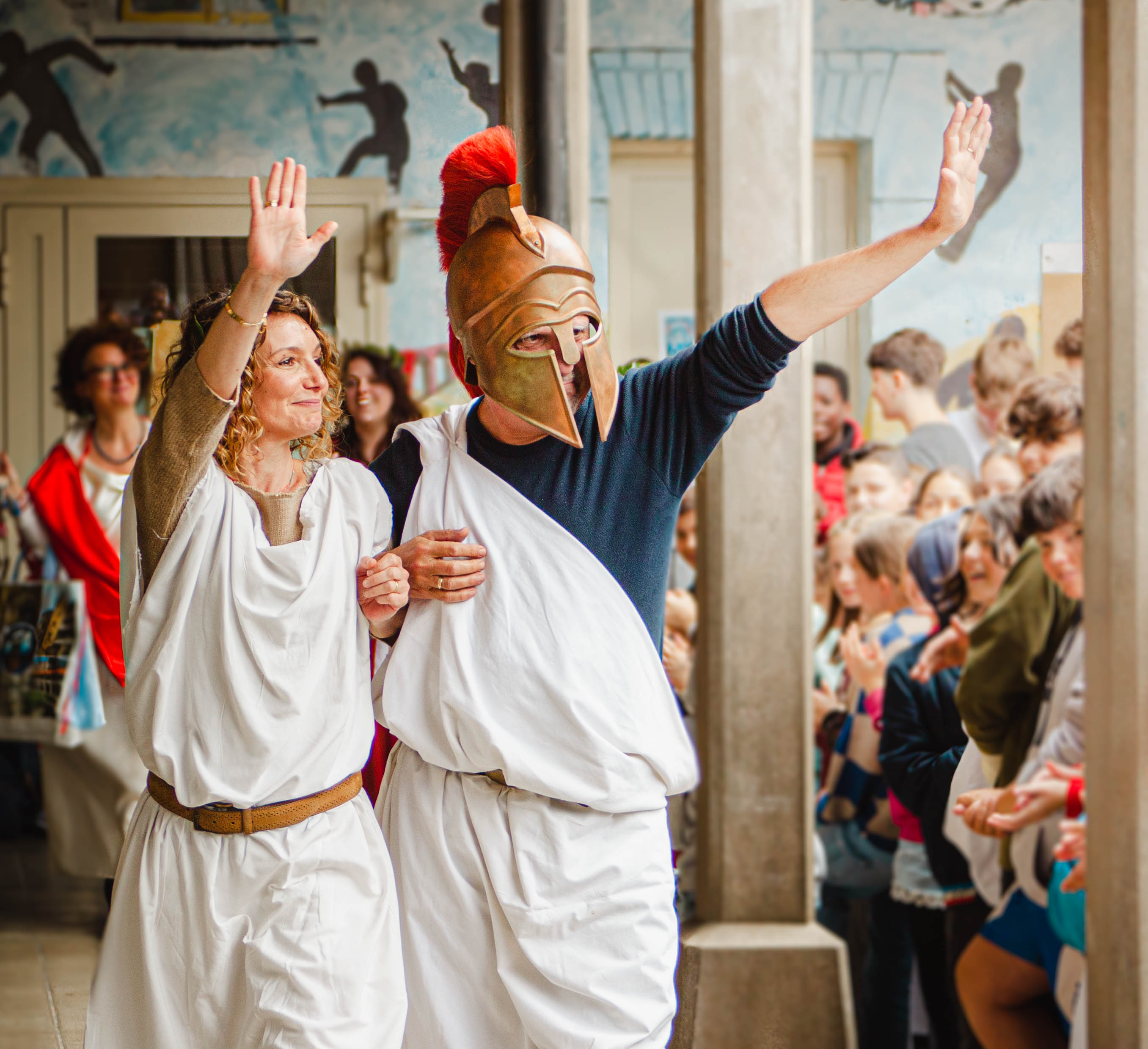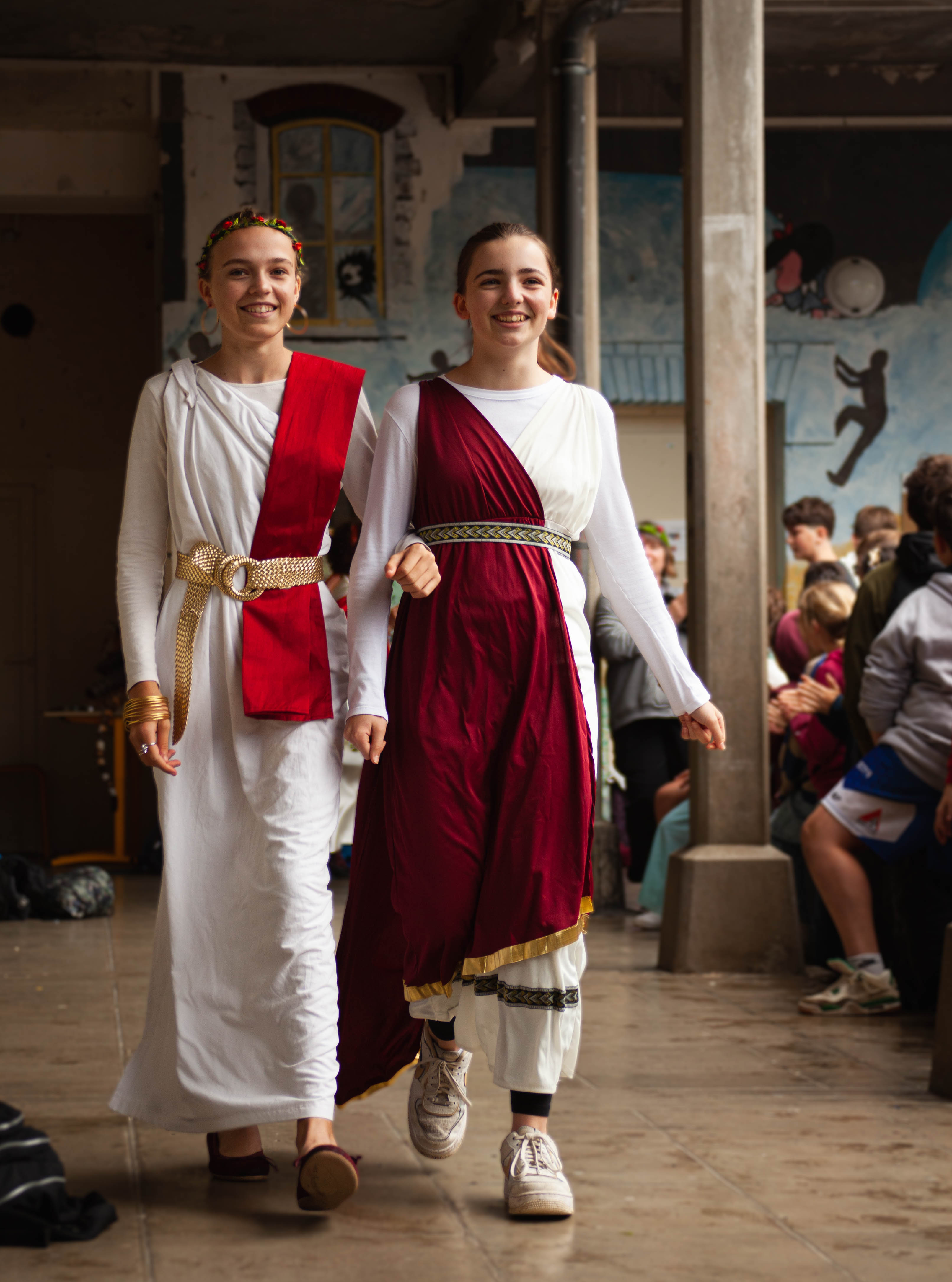 Le jeudi 23 mai, les dieux ont été cléments et ont permis que la « journée toge » ait lieu sous les meilleurs auspices ! Celle-ci a connu trois temps forts : un défilé de mode avec les dernières tendances en matière de tenues antiques, une saynète de théâtre présentée par les 4ème latinistes sur les jeux du cirque , et la réalisation de jeux olympiques bellocois avec une cérémonie d’ouverture en grec ancien, une démonstration d’épreuves antiques et enfin, une course d’athlètes ouverte à tous les collégiens. Devant le succès remporté par cette initiative, il a fallu organiser plusieurs courses, auxquelles ont participé plus de 40 valeureux collégiens, farouches et décidés. Les coureurs victorieux ont reçu naturellement une palme et une couronne d’or.