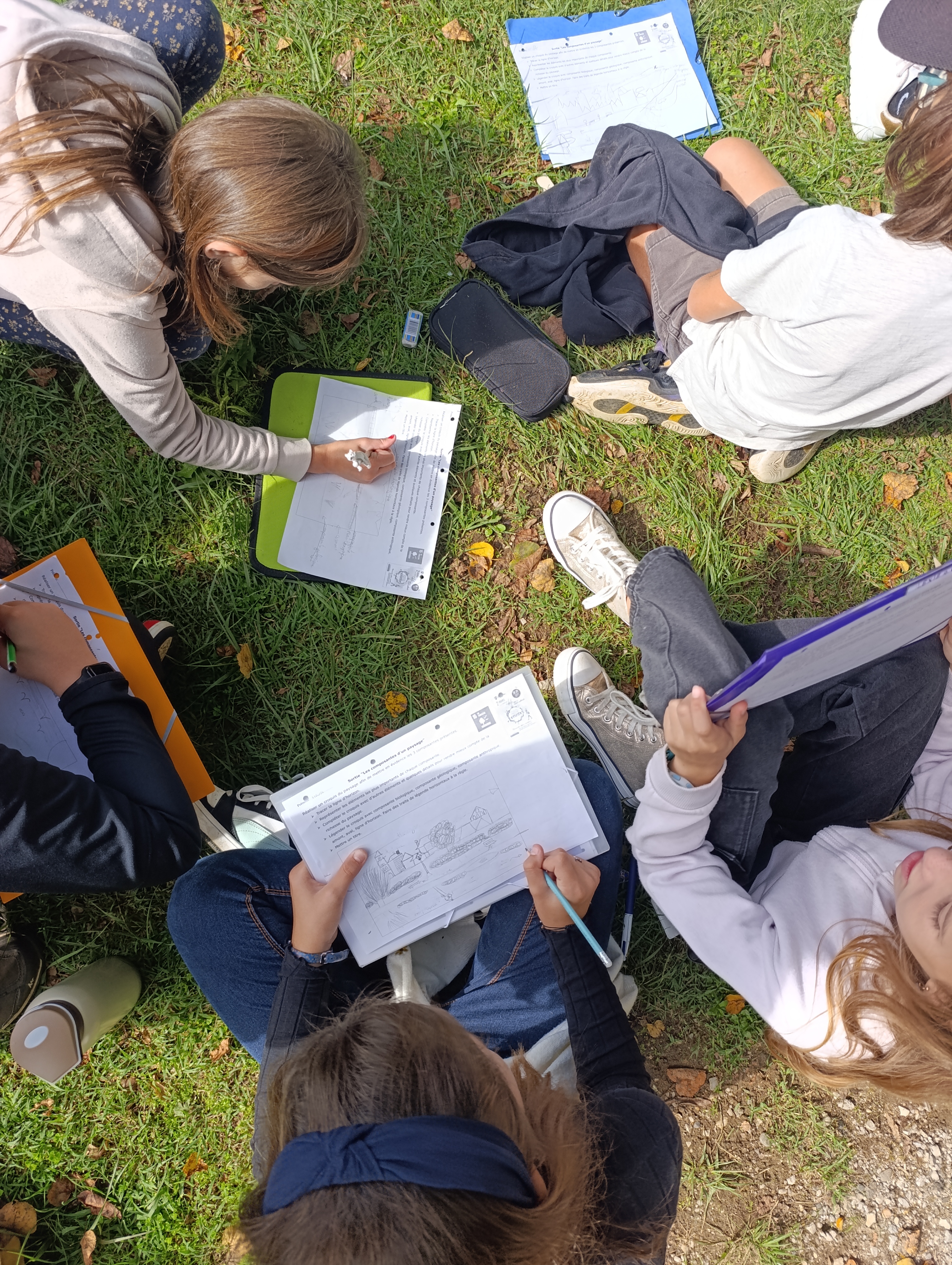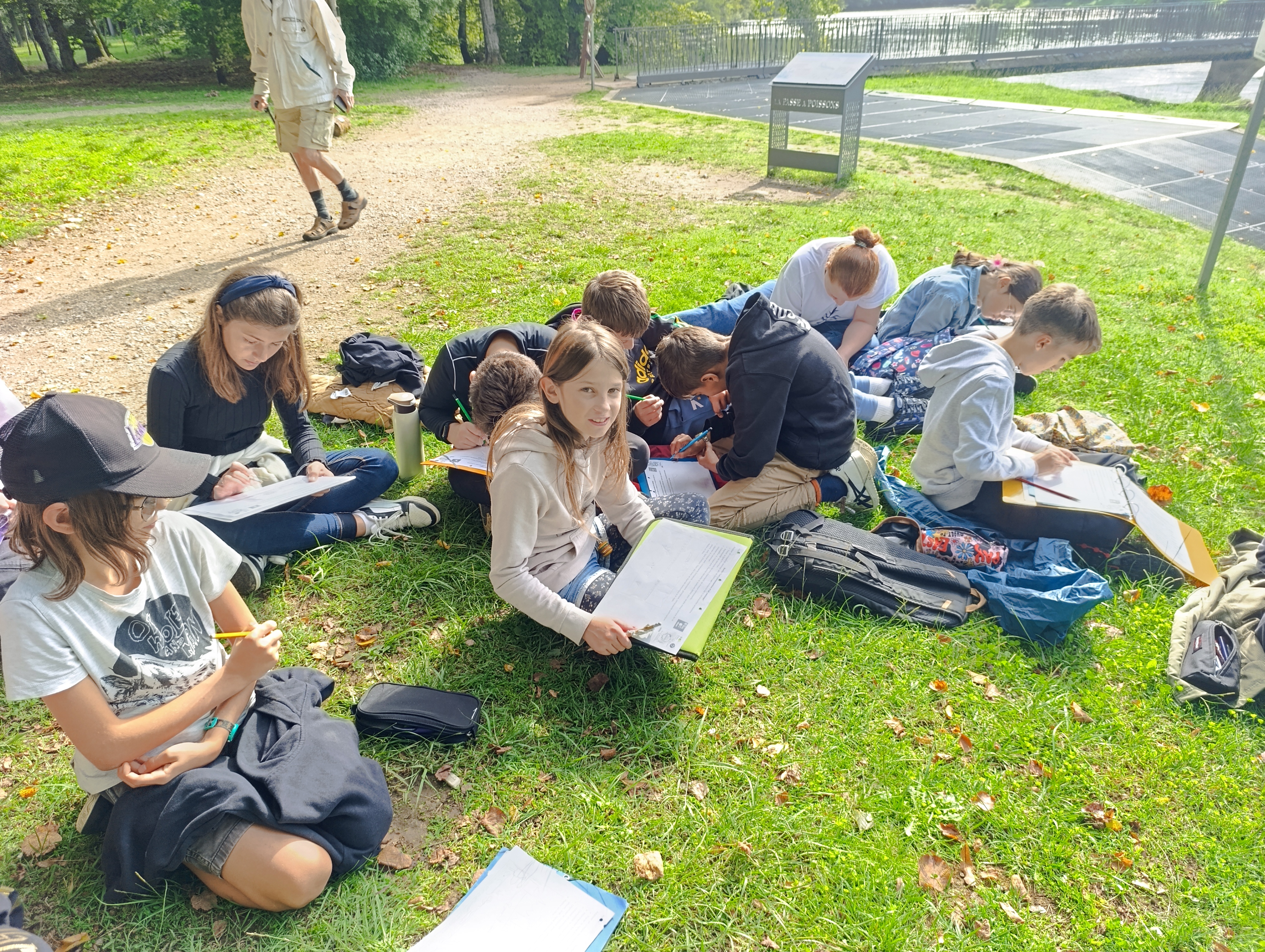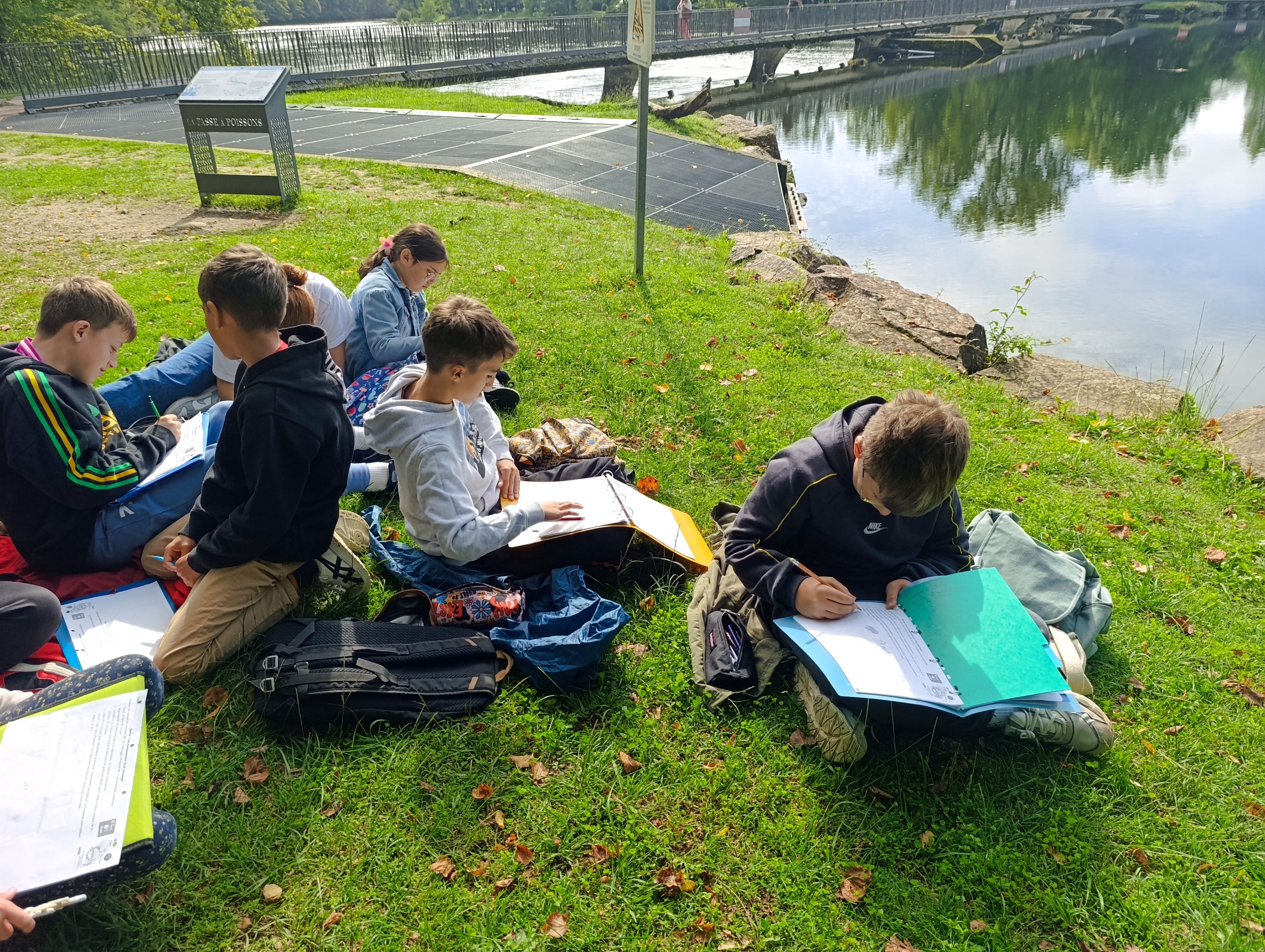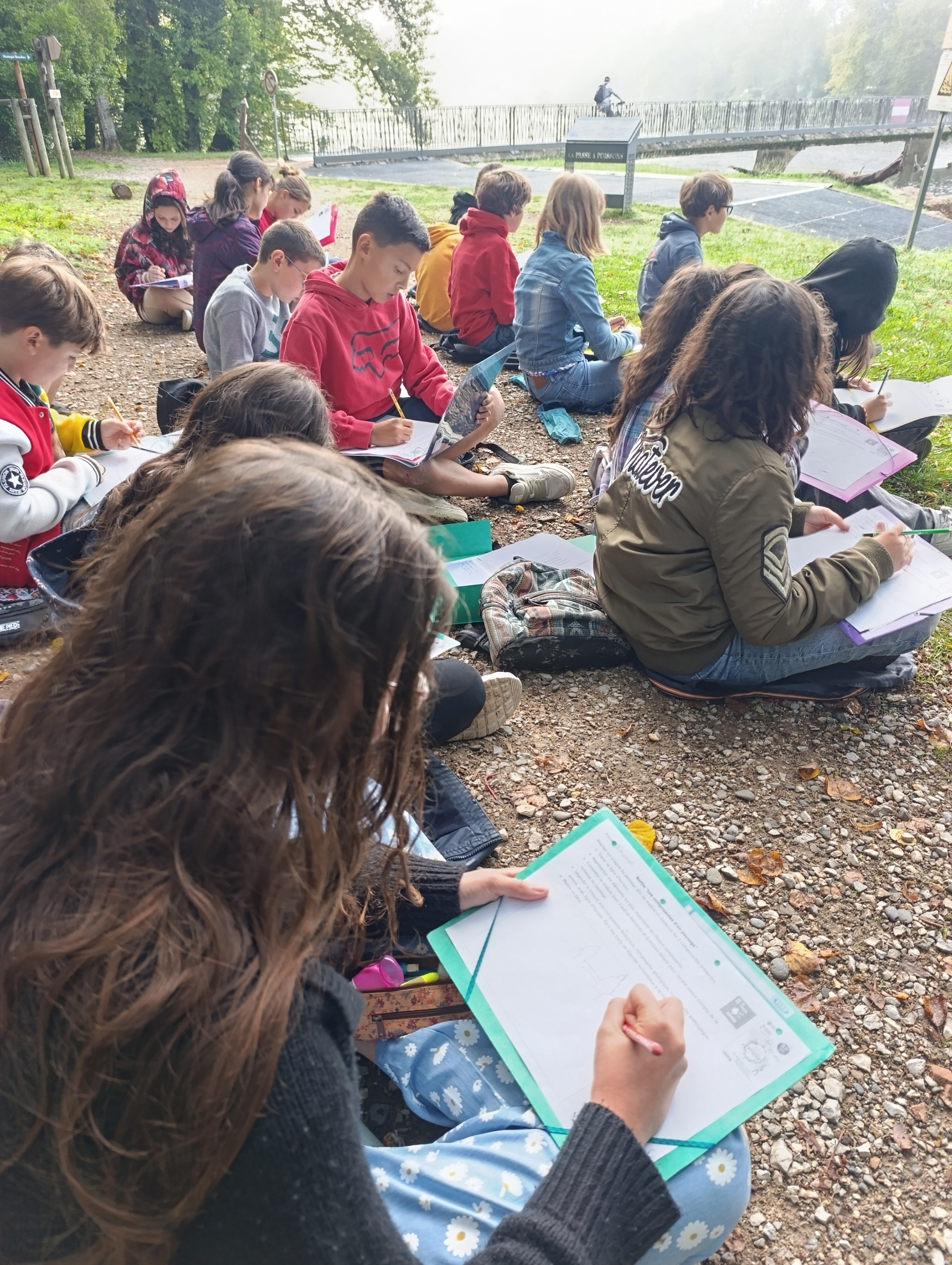 Nous avons aussi réalisé un croquis du paysage afin de mettre en évidence les 3 composantes de l’environnement vues en classe : la composante biologique formée par les êtres vivants et leurs restes, la composante géologique regroupant les éléments naturels non vivants comme la Dordogne et la composante anthropique constituée par toutes les constructions humaines comme la passerelle par exemple.