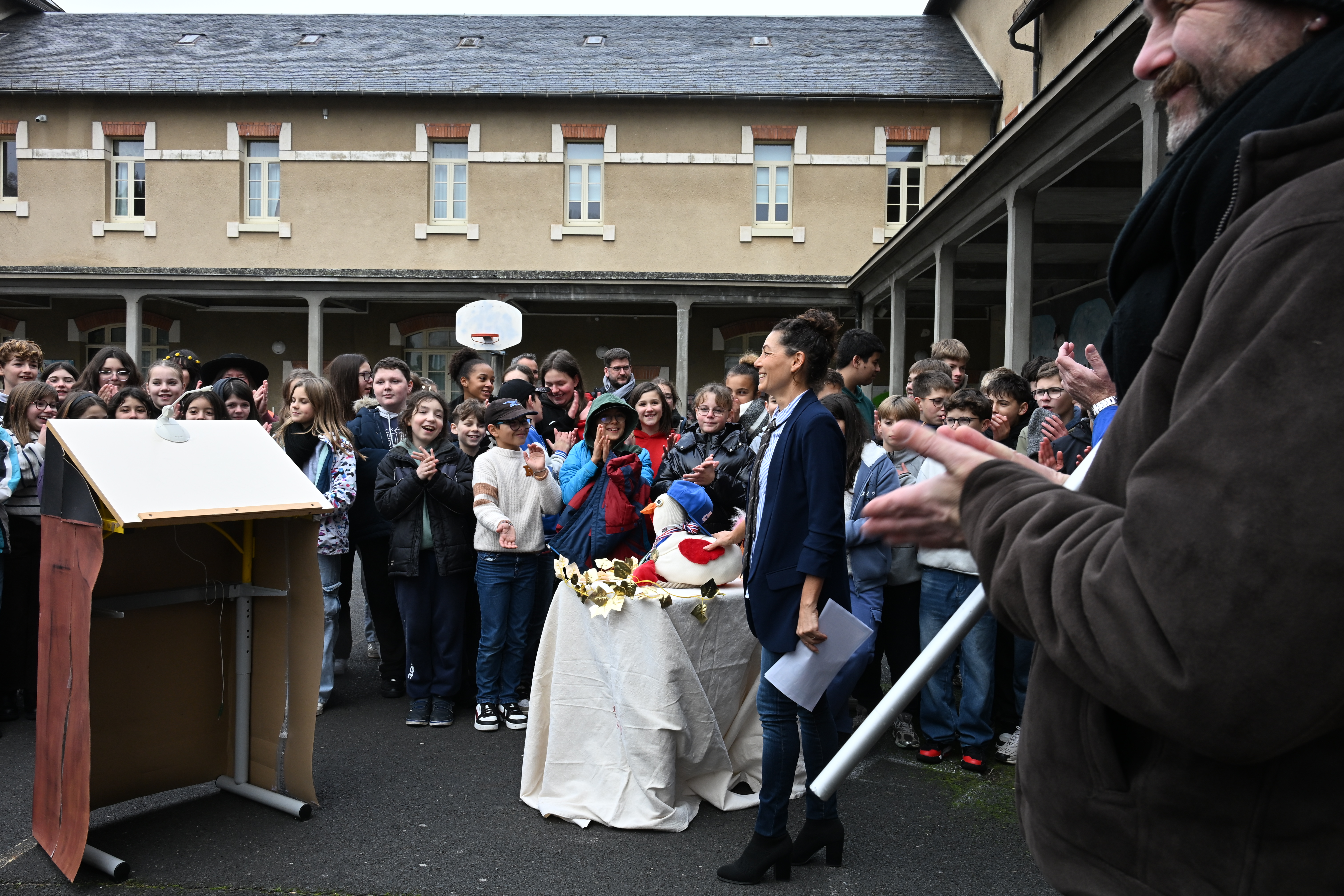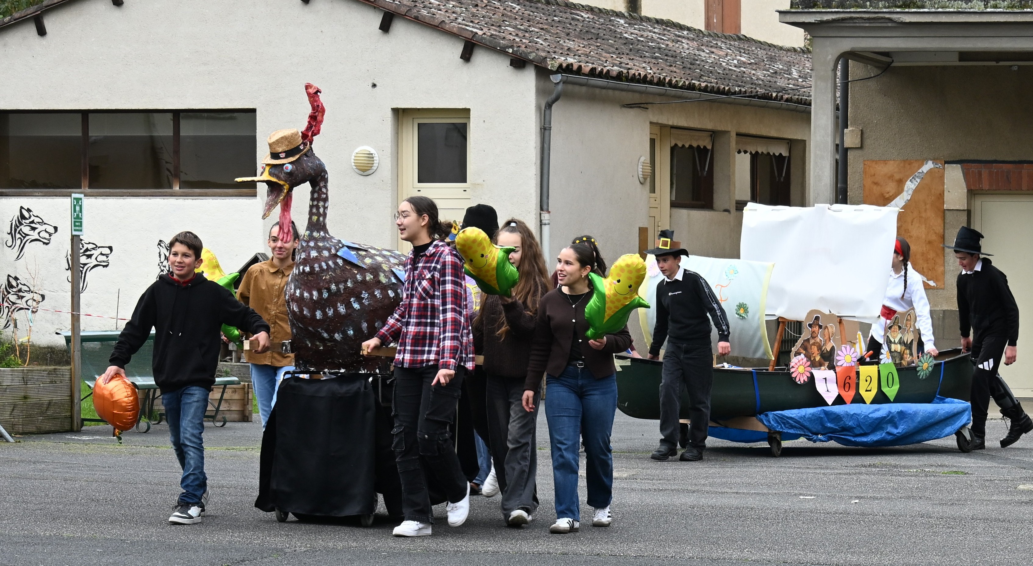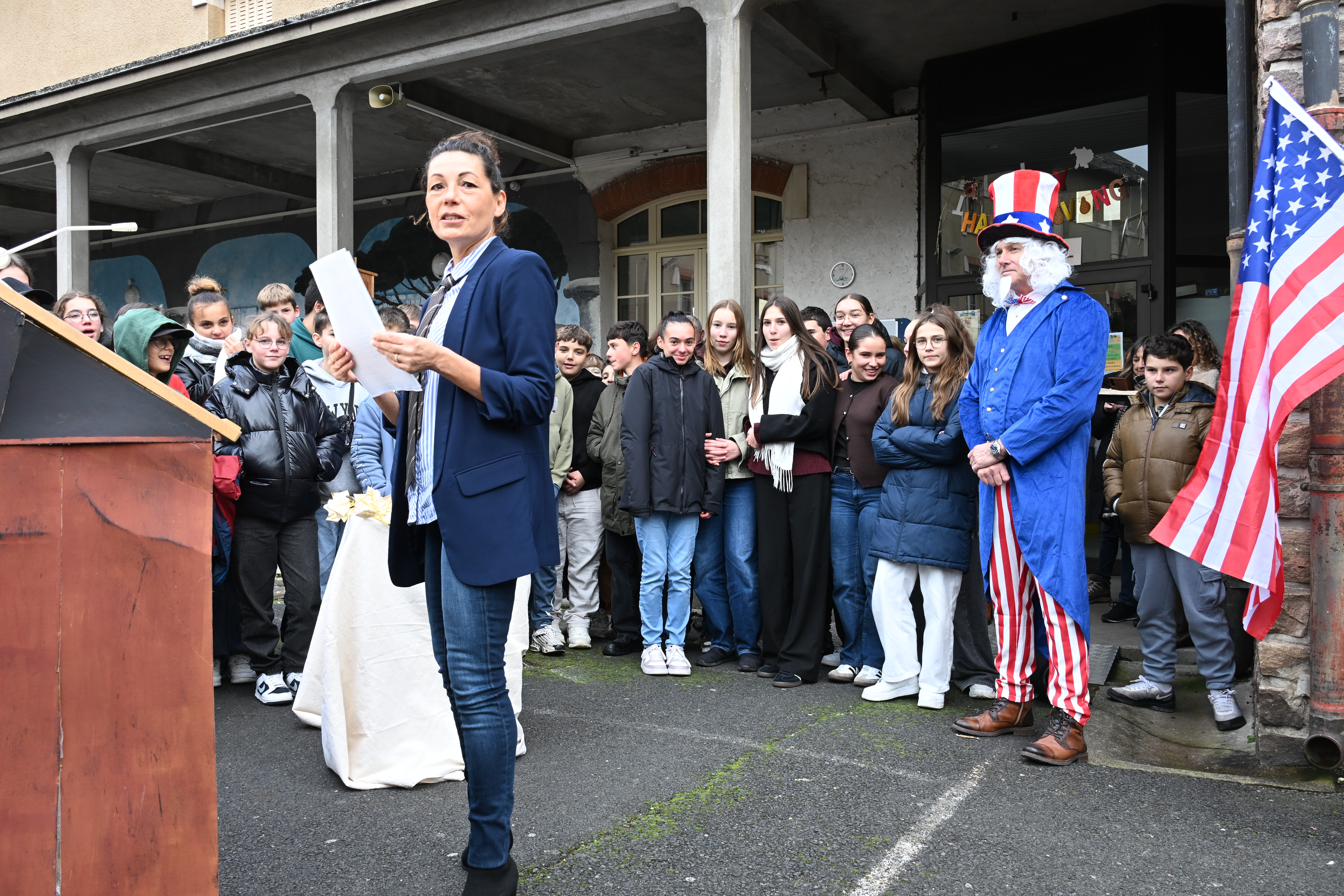 Temps fort de la journée, la cérémonie solennelle de la “grâce de la dinde” (turkey pardon) a été précédée d’un discours empreint d’émotion de Mme Dupuy, principale de l’établissement. Elle a été suivie d’une parade festive dans la cour du collège, ouverte par une impressionnante dinde en plâtre de 60 kilos, réalisée par Paul Gutiez, ancien professeur. Les élèves ont ensuite défilé costumés en personnages emblématiques, du Mayflower à Spiderman, mêlant références culturelles, créativité et bonne humeur. Rapidement, l’ensemble des élèves s’est laissé entraîner dans une joyeuse sarabande.