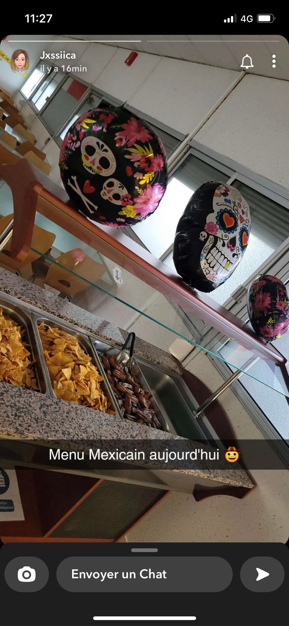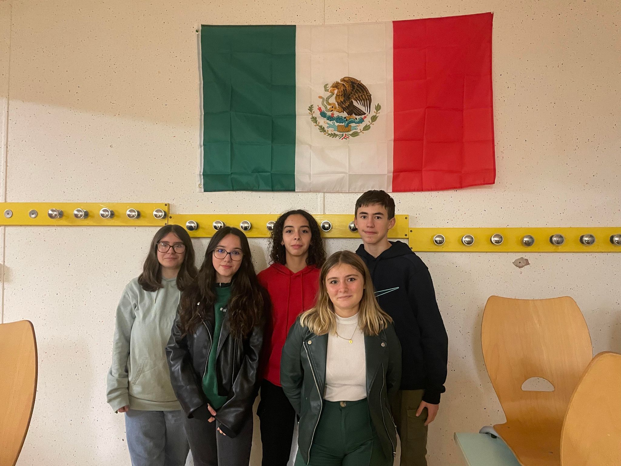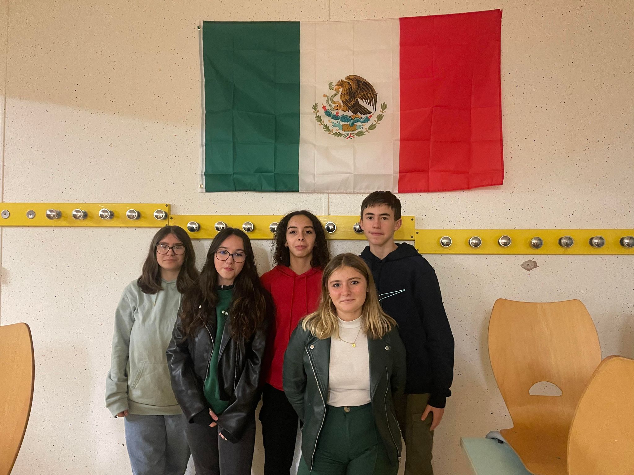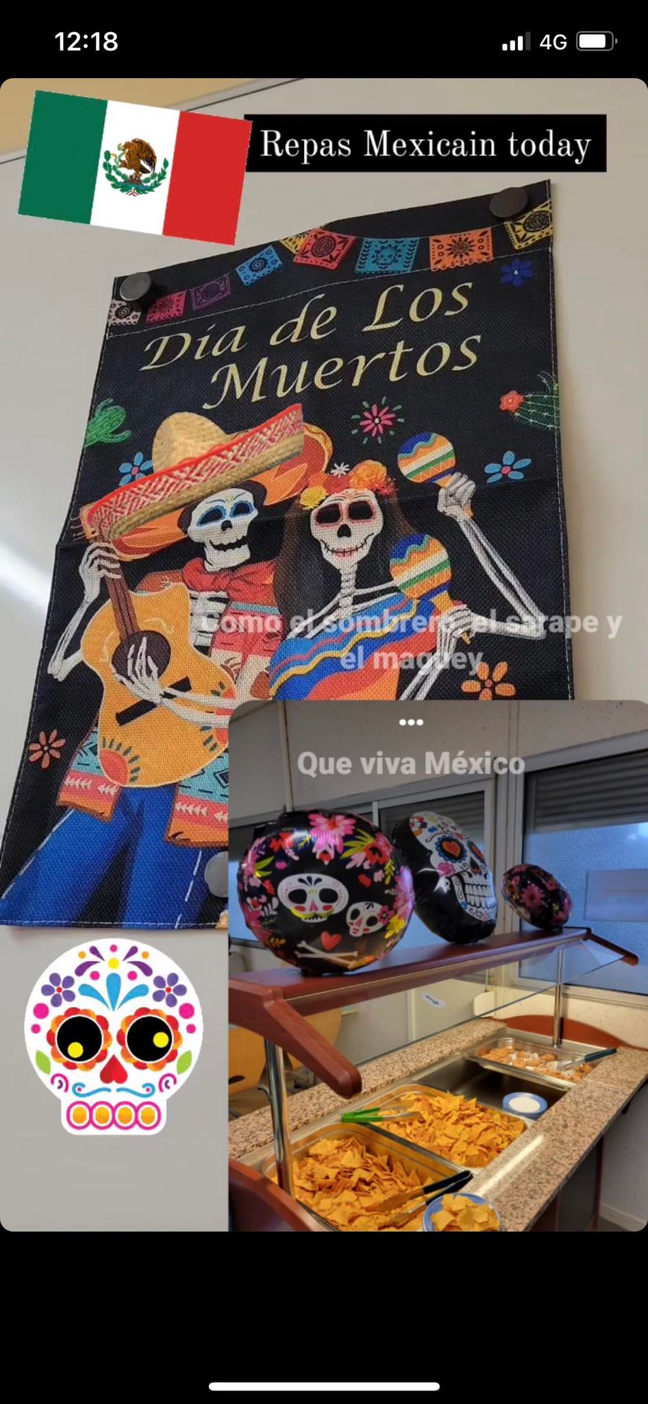 Mardi 14 novembre notre professeur a organisé un repas mexicain. La salle était décorée avec des têtes de morts gonflables, un drapeau mexicain et des ballons verts rouges et blancs.