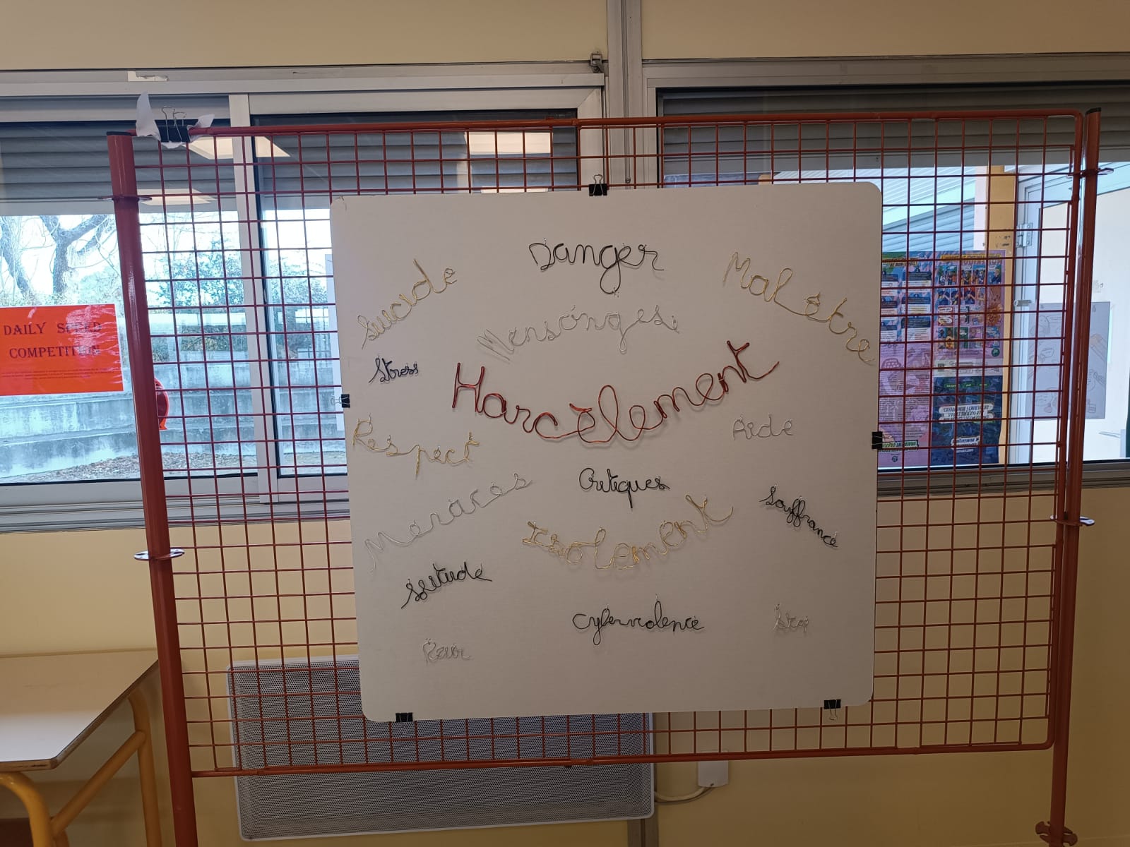 Jeudi 7 novembre 2024, les élèves délégués des classes de 3ème et de 4ème du collège Gisèle HALIMI ont réalisé, avec M. LE BIHAN, CPE, et en partenariat avec l’atelier « Fil de Faire » dirigé par Mme HUMBERT, Professeure documentaliste, un nuage de mots en fil de fer sur le thème du Harcèlement.
