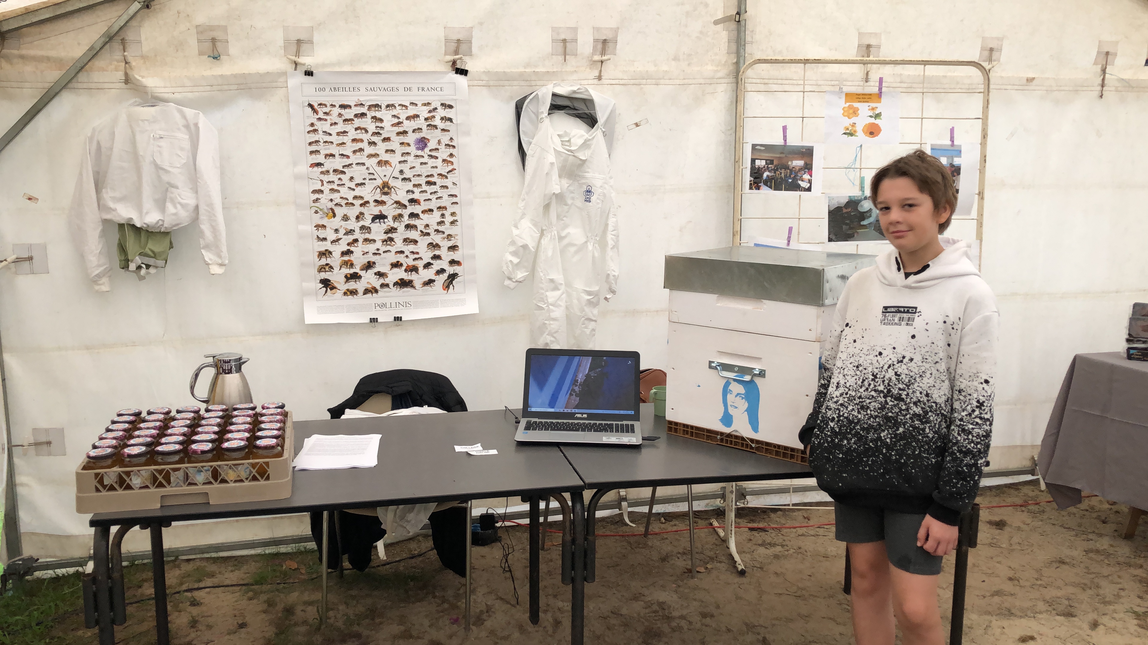 Je remercie les élèves qui sont venus m’épauler, et les parents qui les ont véhiculés. Une mention spéciale pour Zachary, présent dès l’ouverture et qui m’a aidé à mettre le stand en place. Je remercie Alice, Lucas et Enzo, même si les deux derniers ont plutôt souvent paradé dans leurs tenues d’apiculteurs et déambulé dans les allées qu’animé le stand.