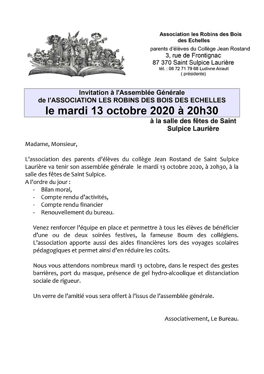 Invitation à l’Assemblée Générale de l’ASSOCIATION LES ROBINS DES BOIS DES ECHELLES