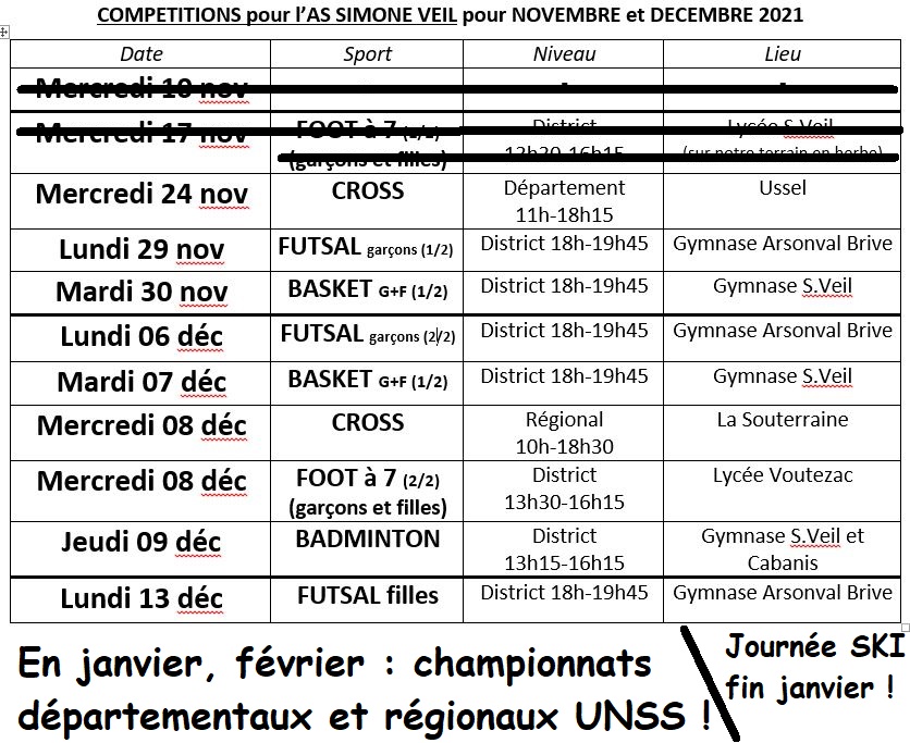 Après un immense "vide" sportif scolaire de mars 2020 à juin 2021, l’Association Sportive du lycée S.Veil a repris en septembre et va passer un grand cap avec un retour à la "normale" dès la rentrée de novembre : Tous les centres d’entrainements reprennent et les élèves des différents lycées brivistes peuvent à nouveau se mélanger dans les différents gymnases et piscine.