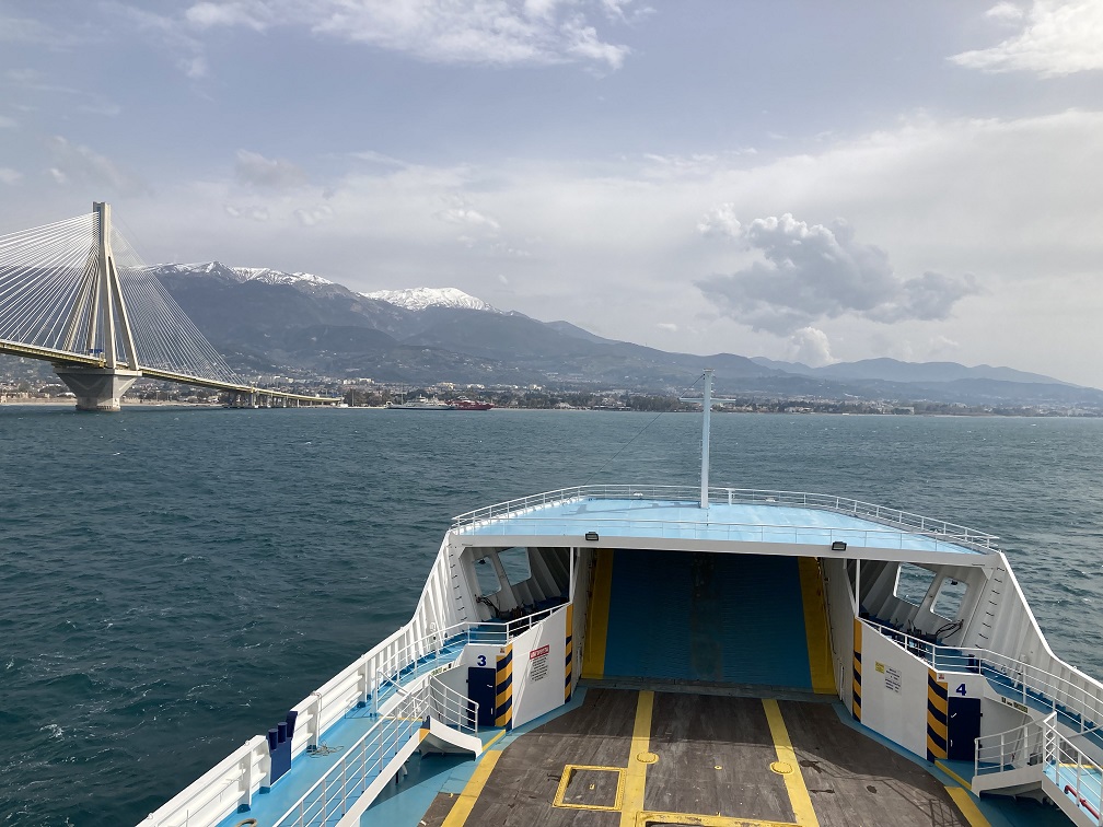 embarquer sur un ferry, franchir le golfe de Corinthe cheveux au vent,