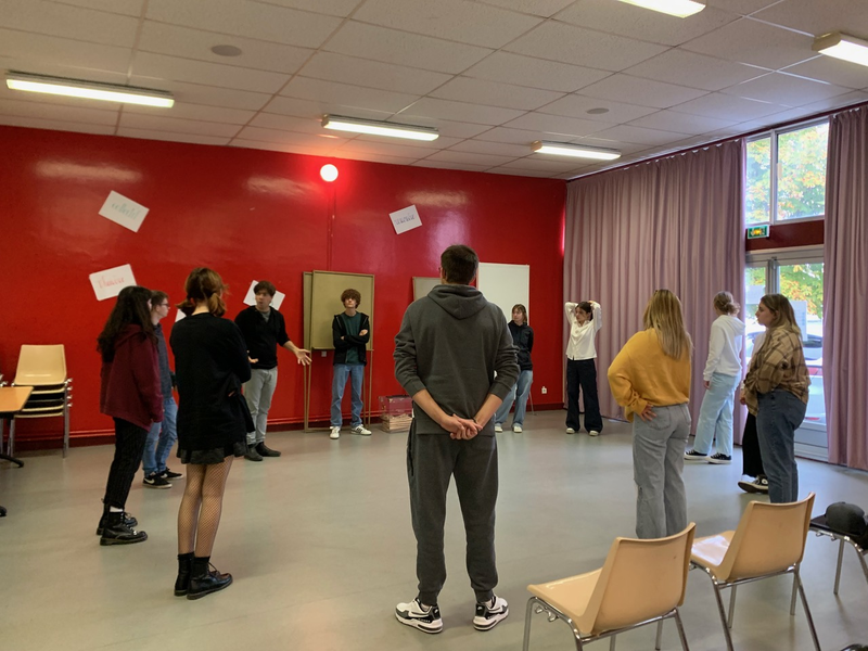 Dans le cadre d’un travail sur les contes de fées revisités, les élèves de 1ère spécialité anglais ont rencontré le lundi 26 septembre 2022 les 2 artistes de la compagnie Carole, oliver & Cies qui leur ont proposé deux ateliers : un atelier en anglais d’exercices d’échauffement théâtral pour travailler la posture, le regard, la connexion, la communication… (techniques que les élèves pourront utiliser pour toutes leurs présentations orales quelle que soit la matière, ainsi que pour le grand oral) et un atelier théâtre d’objet.