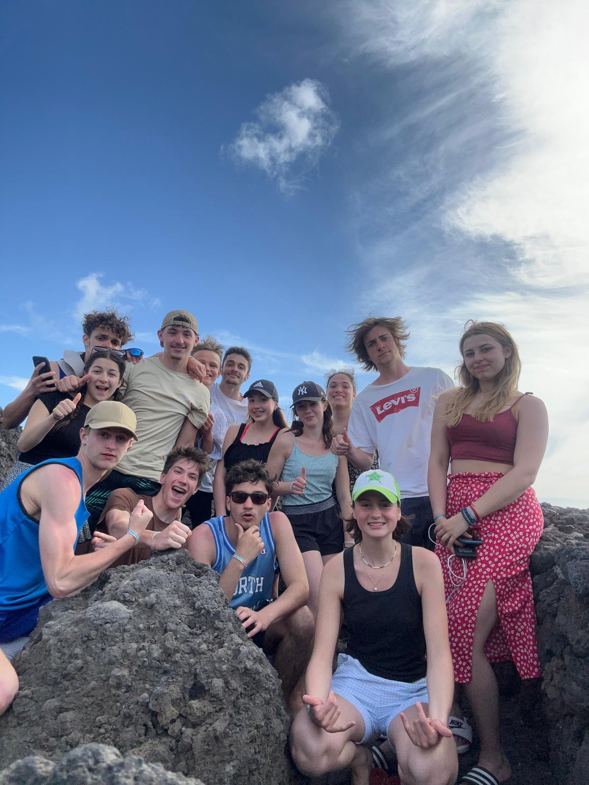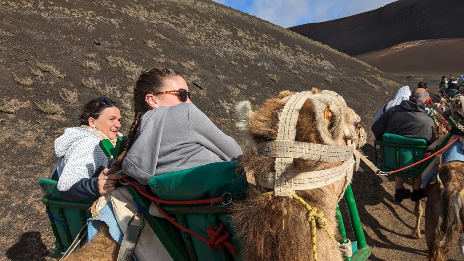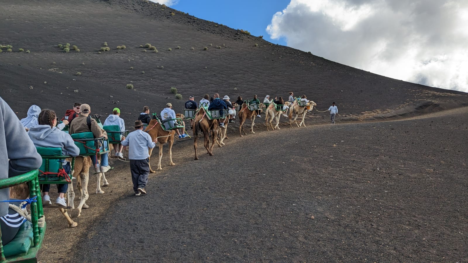 "Nous sommes arrivés à Lanzarote mercredi soir. Dès l’arrivée à l’hôtel et les chambres distribuées, monsieur Montiel a fait un briefing sur l’organisation du séjour à l’ensemble du groupe (élèves, professeurs et moniteurs). Il y a des chances pour que cela se reproduise tous les soirs. Le jeudi matin nous sommes partis à Echadero de Los Camellos faire une promenade à dos de dromadaire. Ces chameaux d’Afrique ont été importés aux Canaries aux 19eme siècle pour travailler dans les champs. À l’époque ils devaient supporter des charges lourdes, aujourd’hui, ils proménent les touristes sur les flancs du volcan. Notre balade a duré une vingtaine de minutes sur environ 500 mètres dans un paysage aride et volcanique.