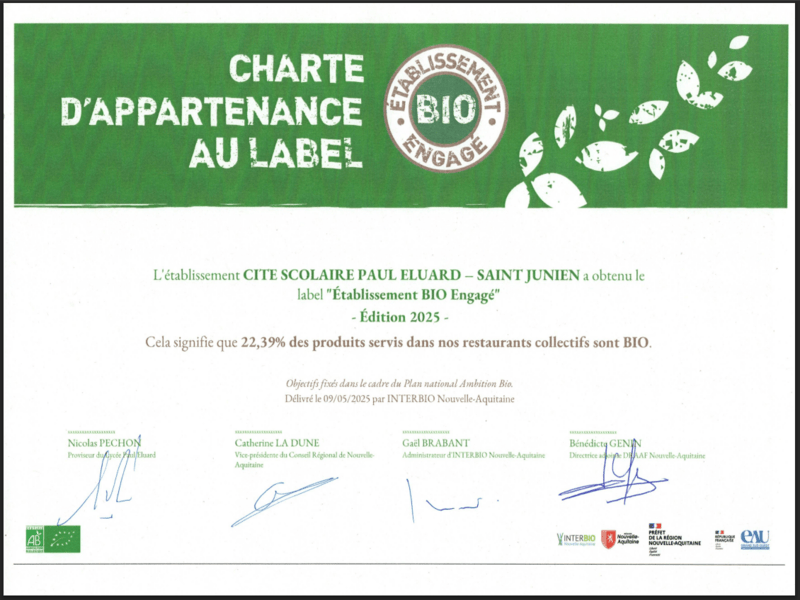 La cité scolaire de Saint-Junien s’est vue décerner le label Bio Engagé le vendredi 9 mai 2025, une reconnaissance importante qui souligne son engagement en faveur d’une alimentation saine, locale et respectueuse de l’environnement. Ce label valorise la cité scolaire qui intègre une part significative de produits issus de l’agriculture biologique dans les 800 repas/jour servis aux élèves et aux personnels.