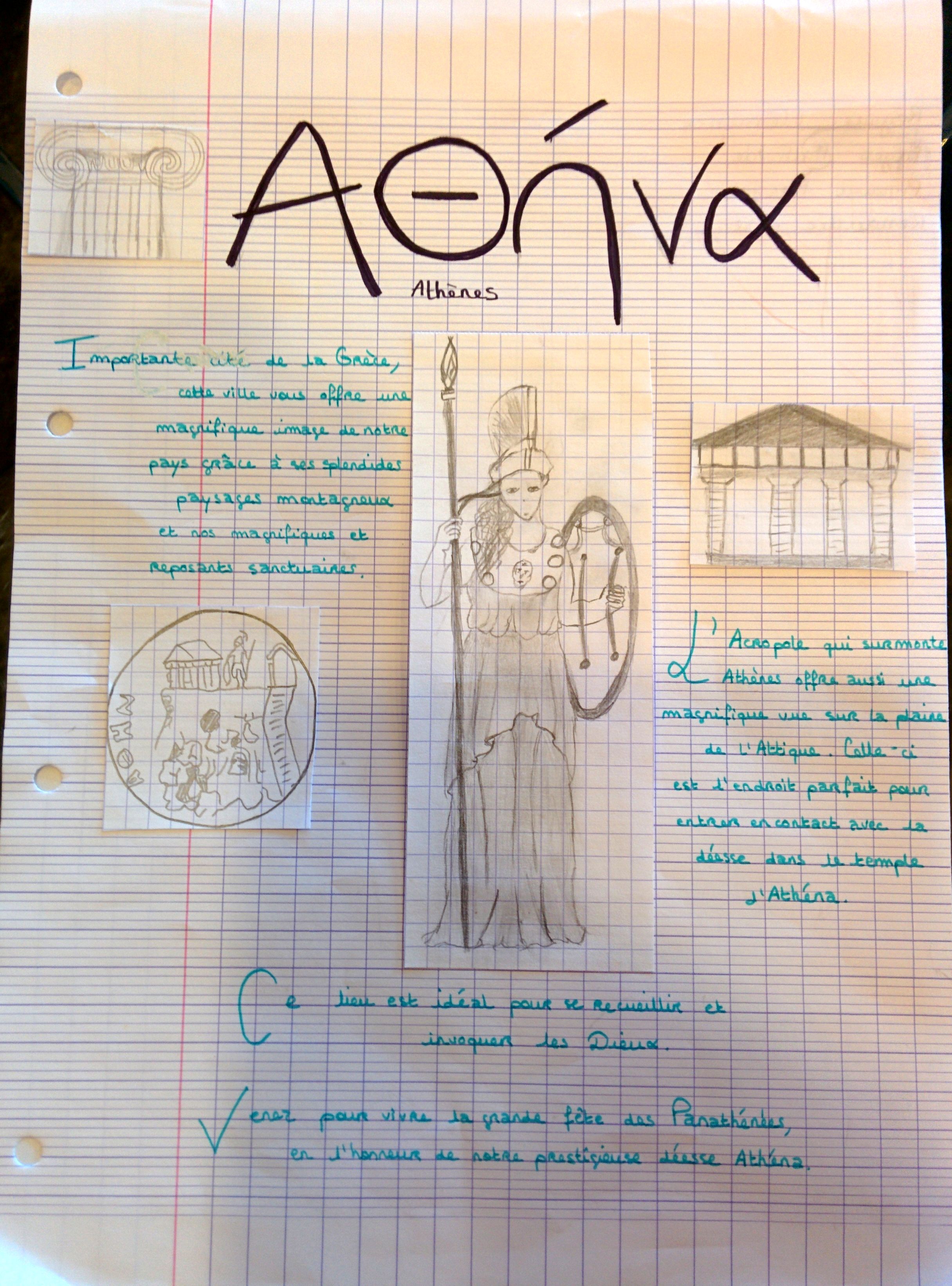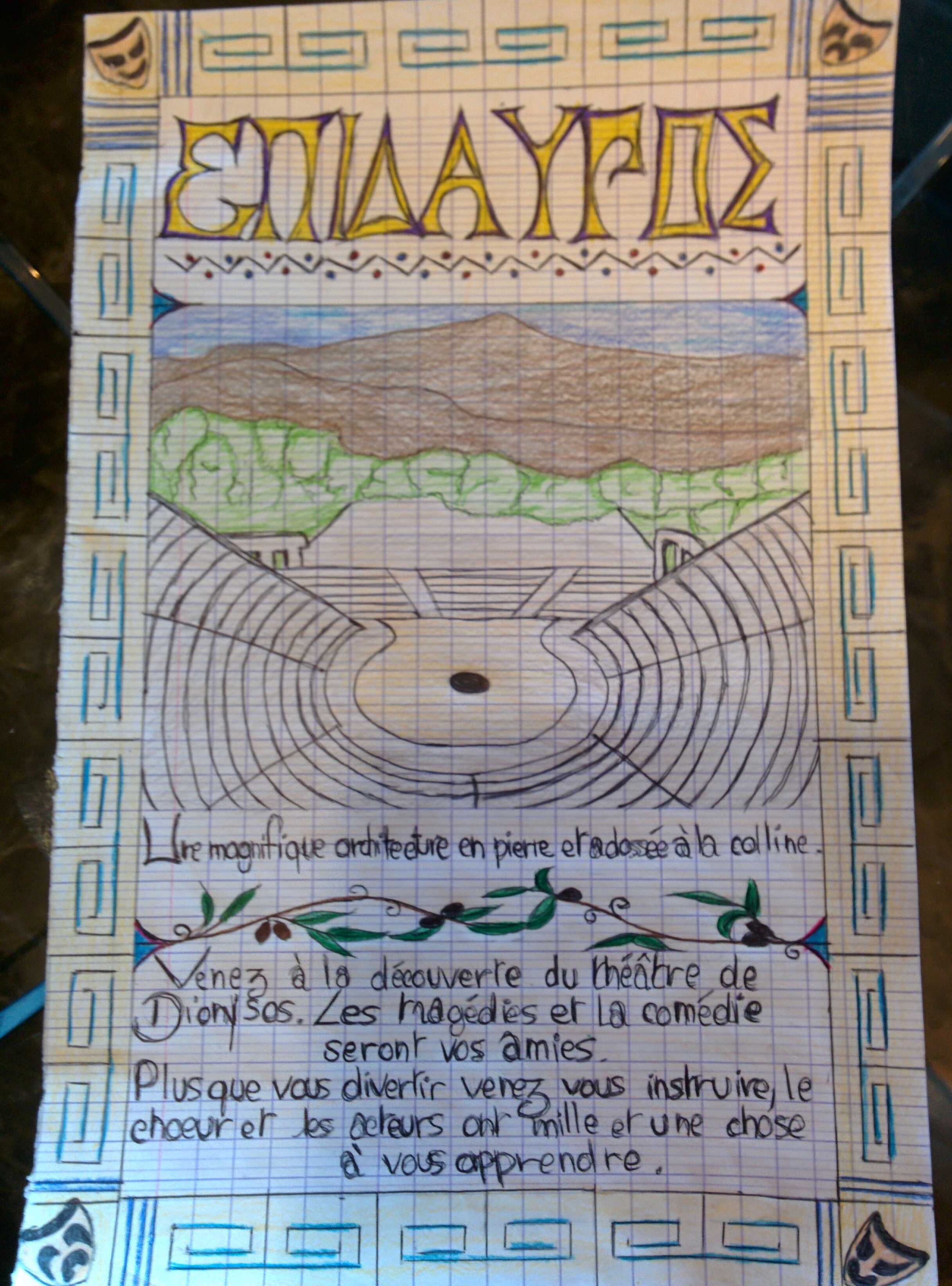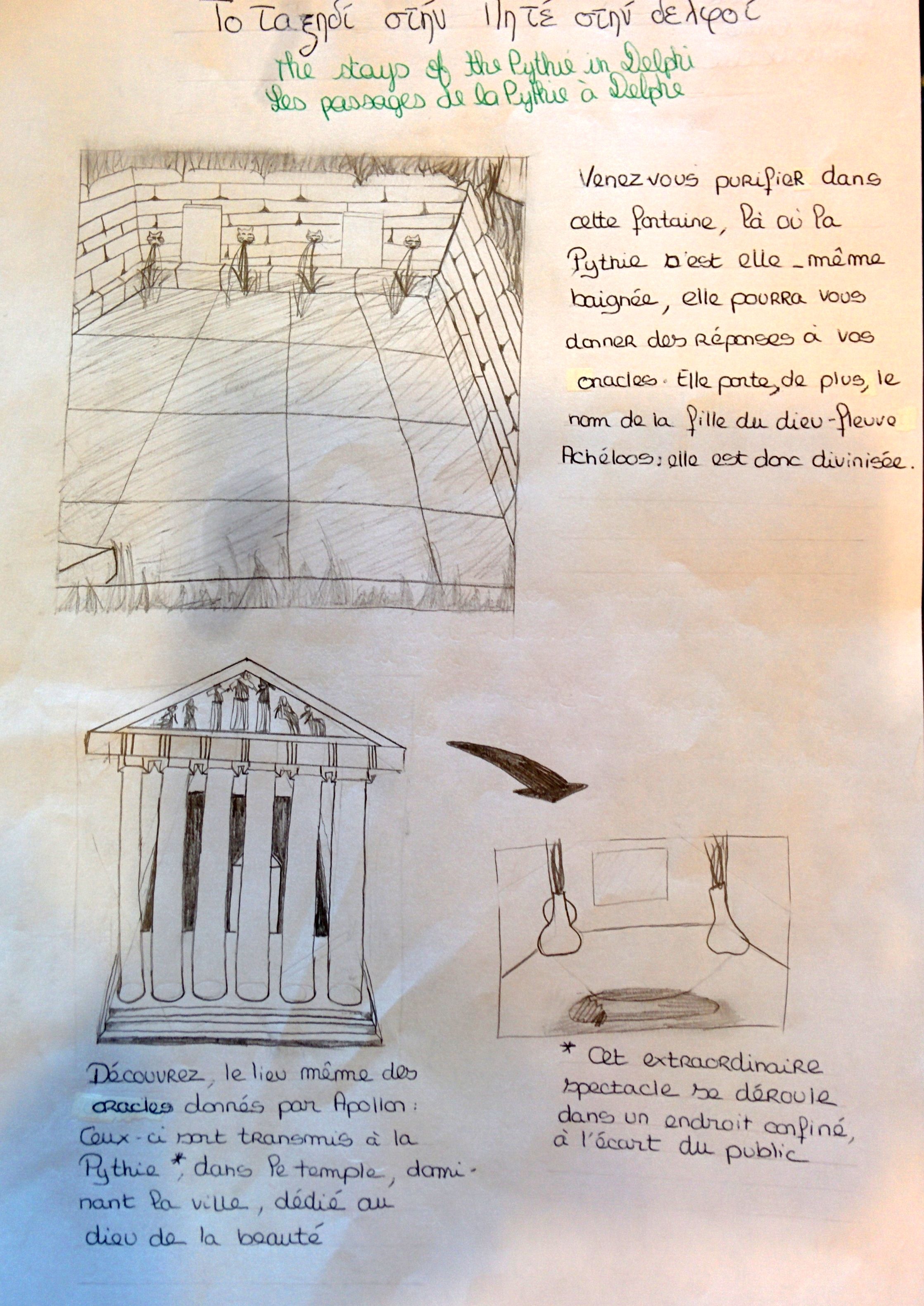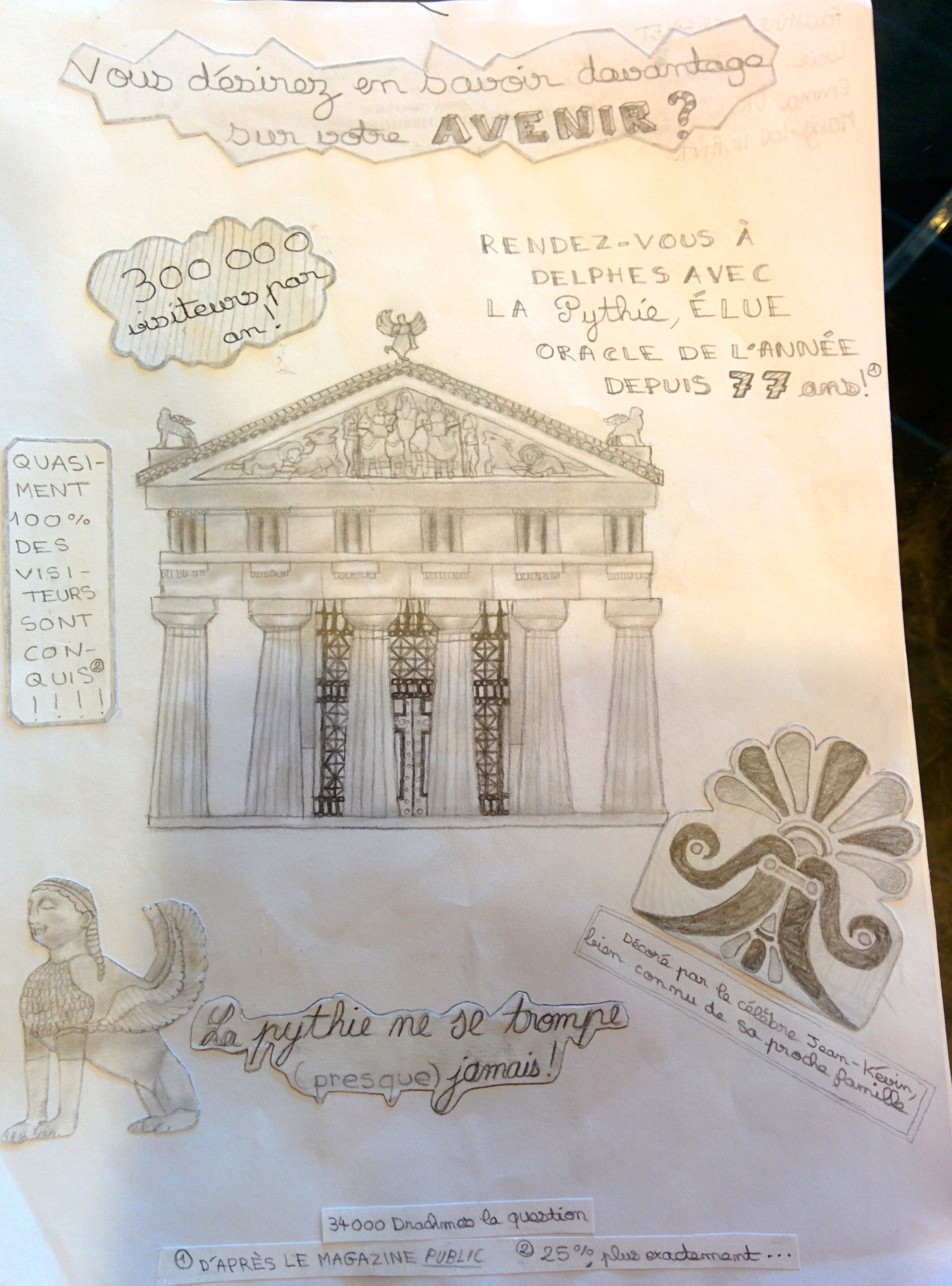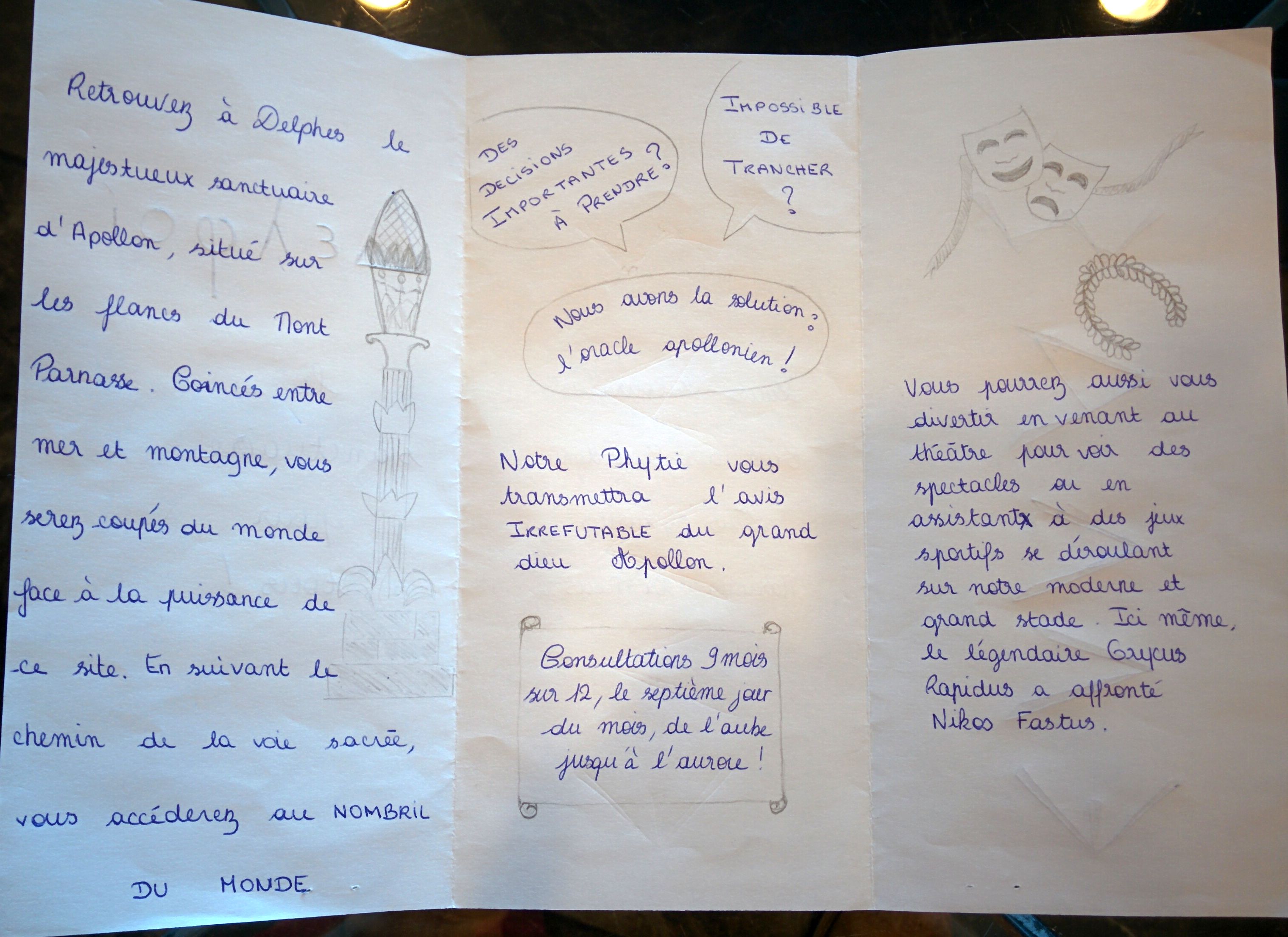 La consigne donnée à nos élèves était simple : tout au long du séjour, nous avons vu des sites antiques qui se sont révélés pour la plupart être des sanctuaires. Ceux-ci ont fait l’objet de pèlerinage, ou de déplacement pour participer à des jeux ou à des manifestations dédiés aux dieux associés à chacun de ses sites. Comment choisir une destination dans l’antiquité ? Il fallait donc mettre ces sites en concurrence et chercher à attirer le visiteur antique... C’est le défi auquel ont répondu nos élèves sur le bateau, souvent avec humour... et avec les moyens du bord. Soyez donc indulgent sur la qualité finale, et pardonnez nous pour la qualité des photographies...