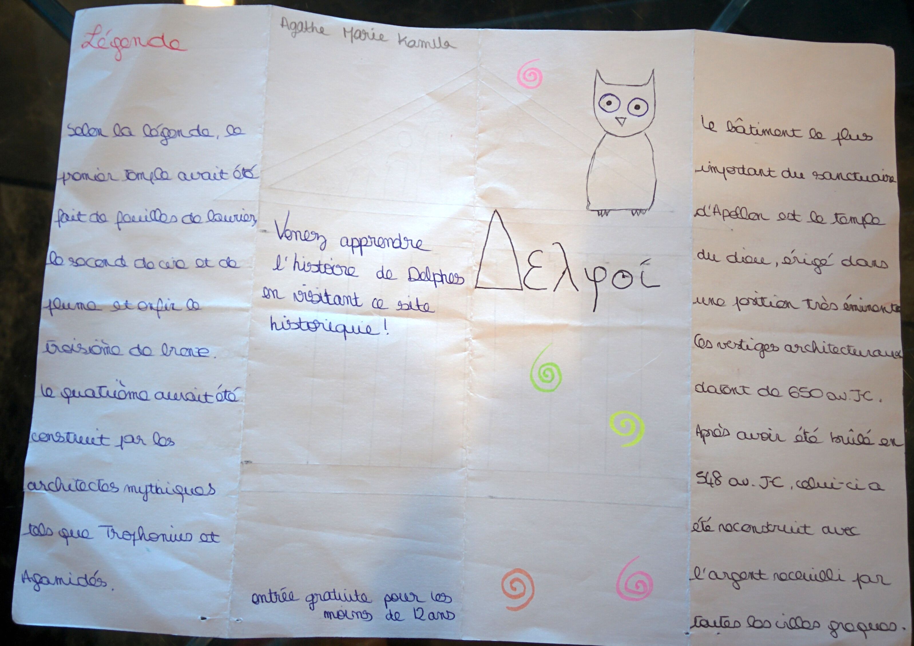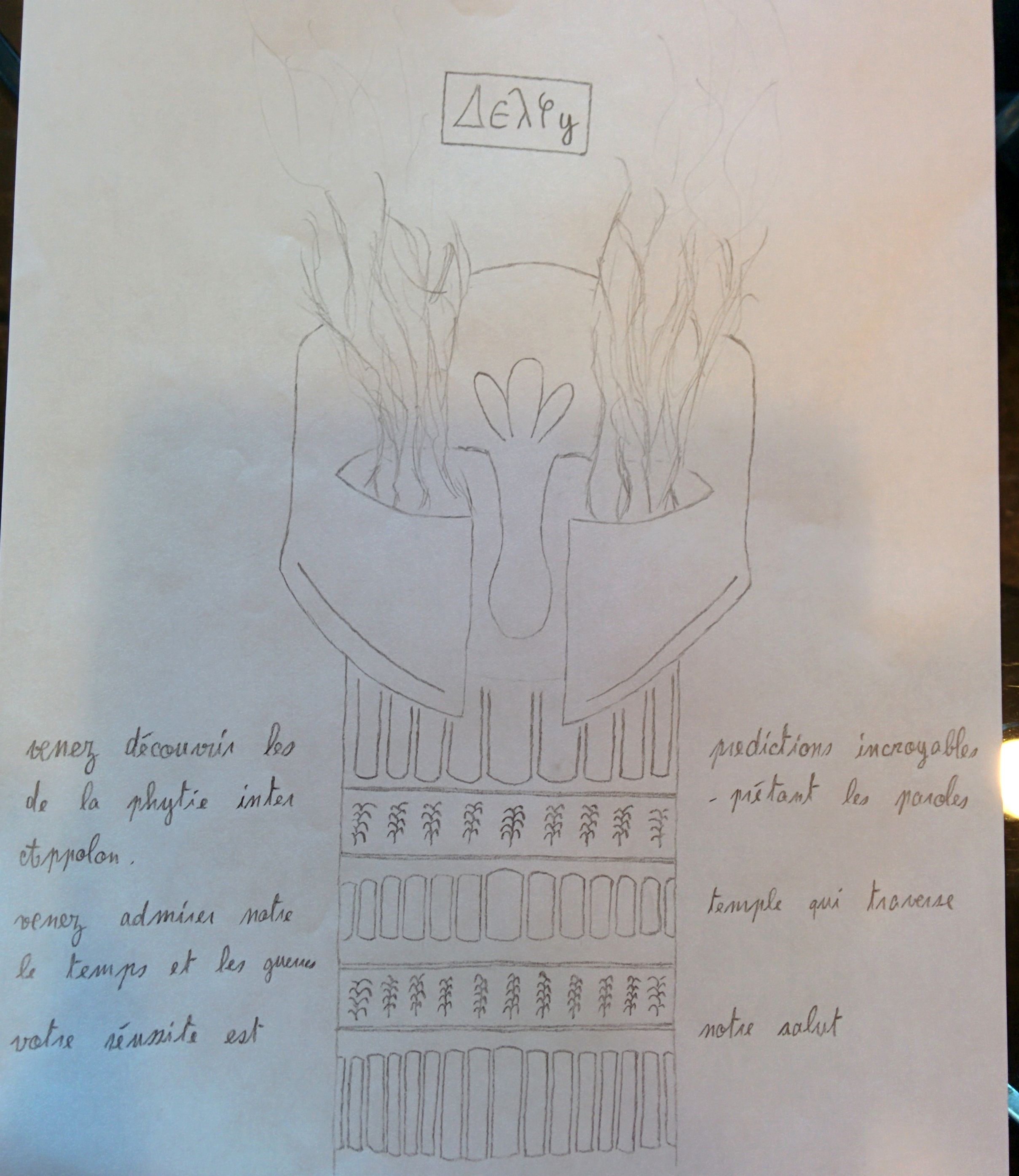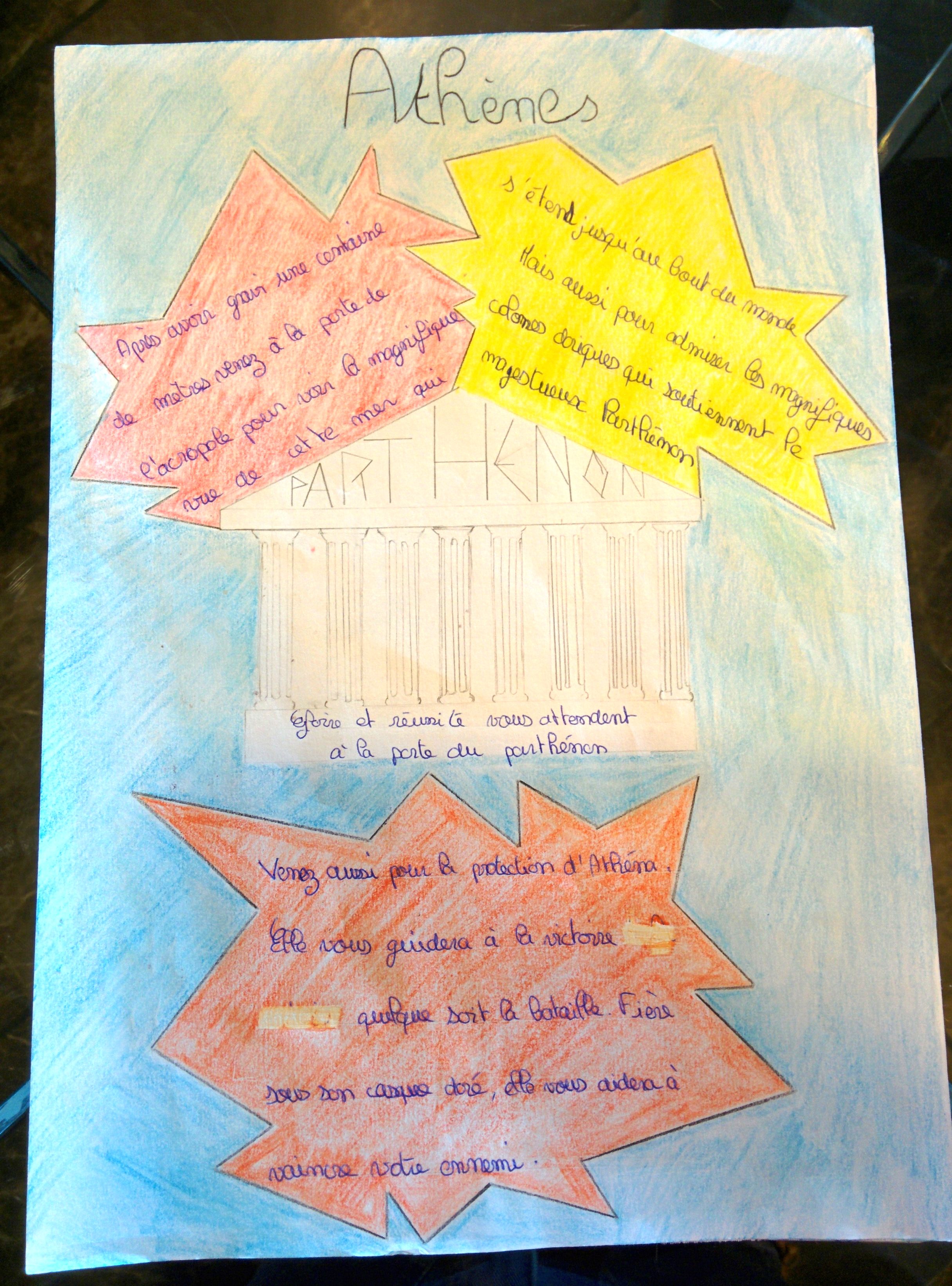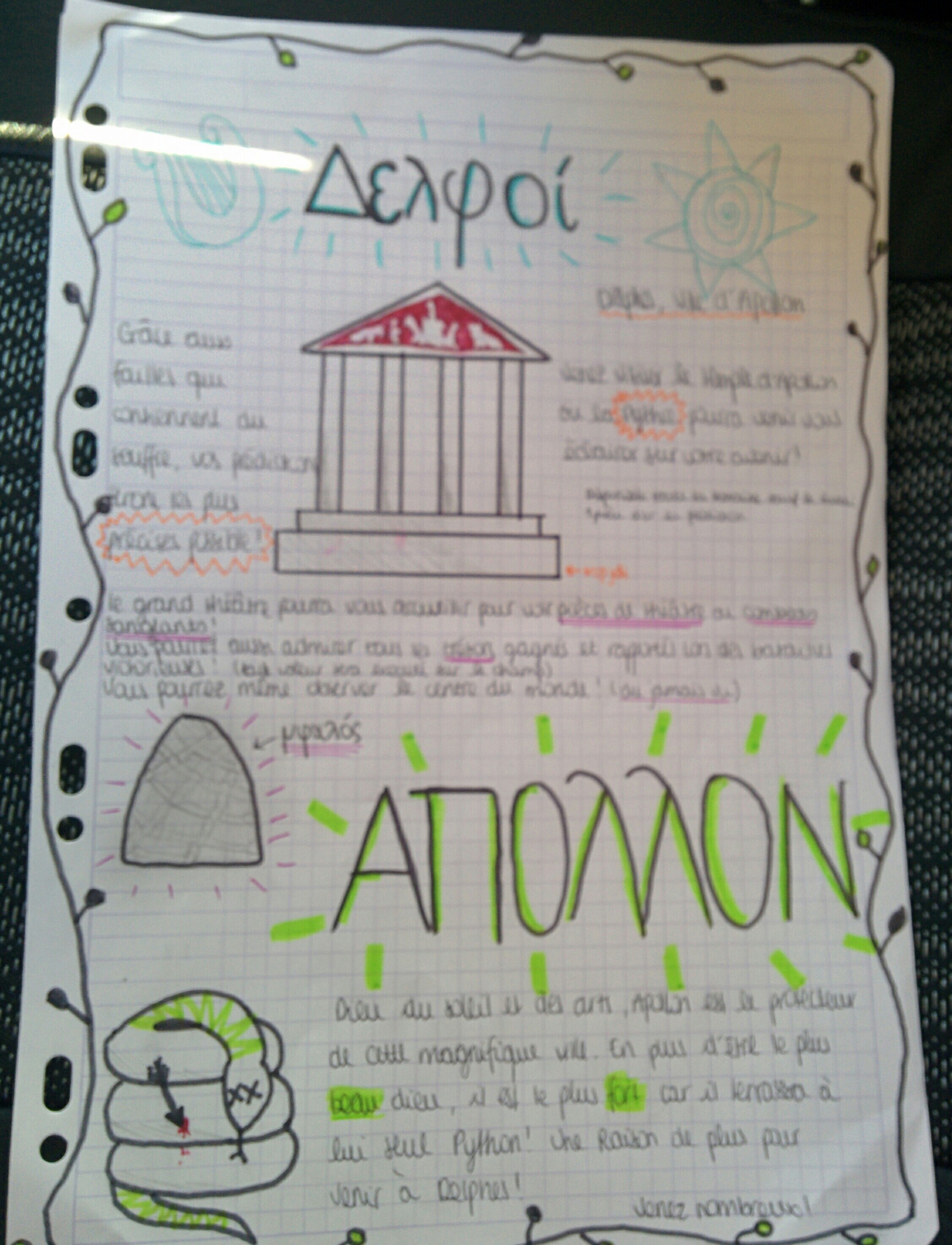 La consigne donnée à nos élèves était simple : tout au long du séjour, nous avons vu des sites antiques qui se sont révélés pour la plupart être des sanctuaires. Ceux-ci ont fait l’objet de pèlerinage, ou de déplacement pour participer à des jeux ou à des manifestations dédiés aux dieux associés à chacun de ses sites. Comment choisir une destination dans l’antiquité ? Il fallait donc mettre ces sites en concurrence et chercher à attirer le visiteur antique... C’est le défi auquel ont répondu nos élèves sur le bateau, souvent avec humour... et avec les moyens du bord. Soyez donc indulgent sur la qualité finale, et pardonnez nous pour la qualité des photographies...