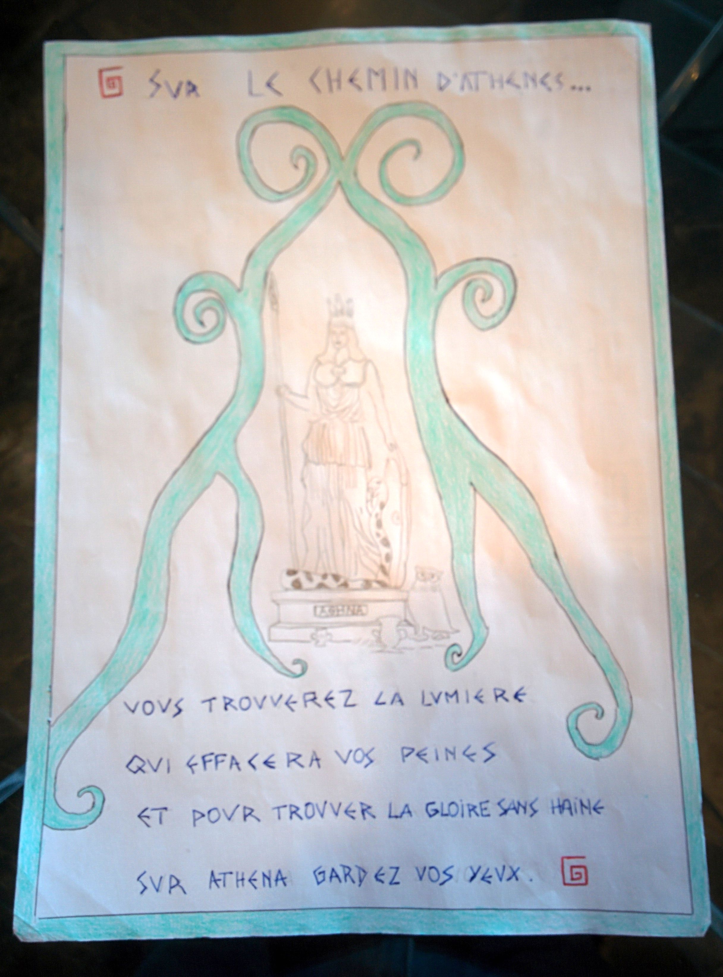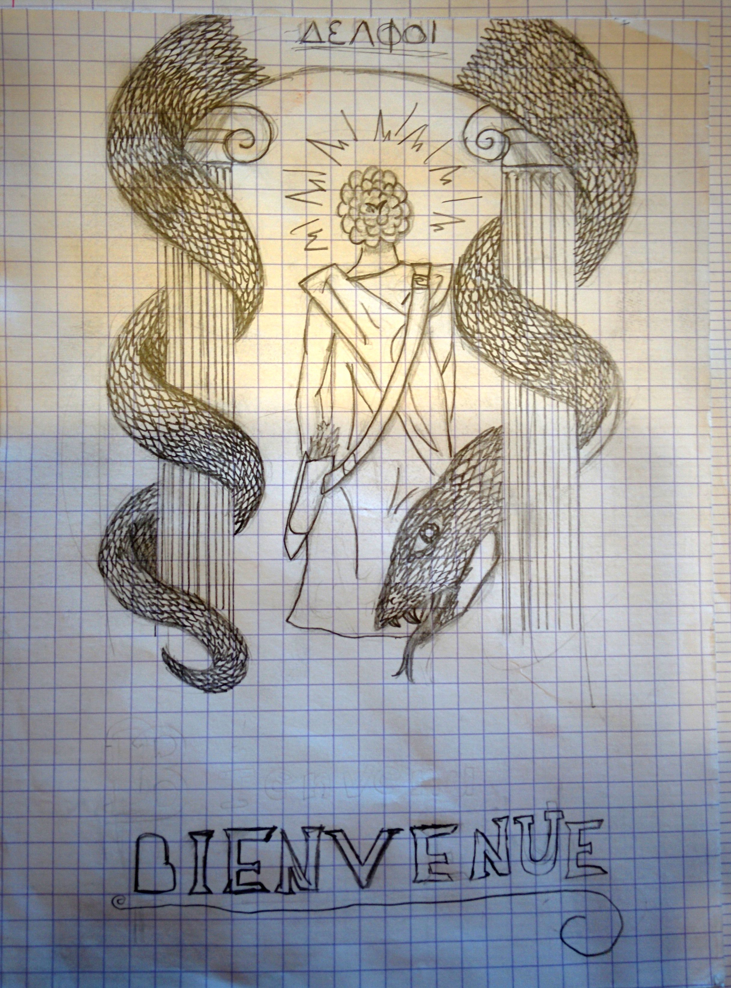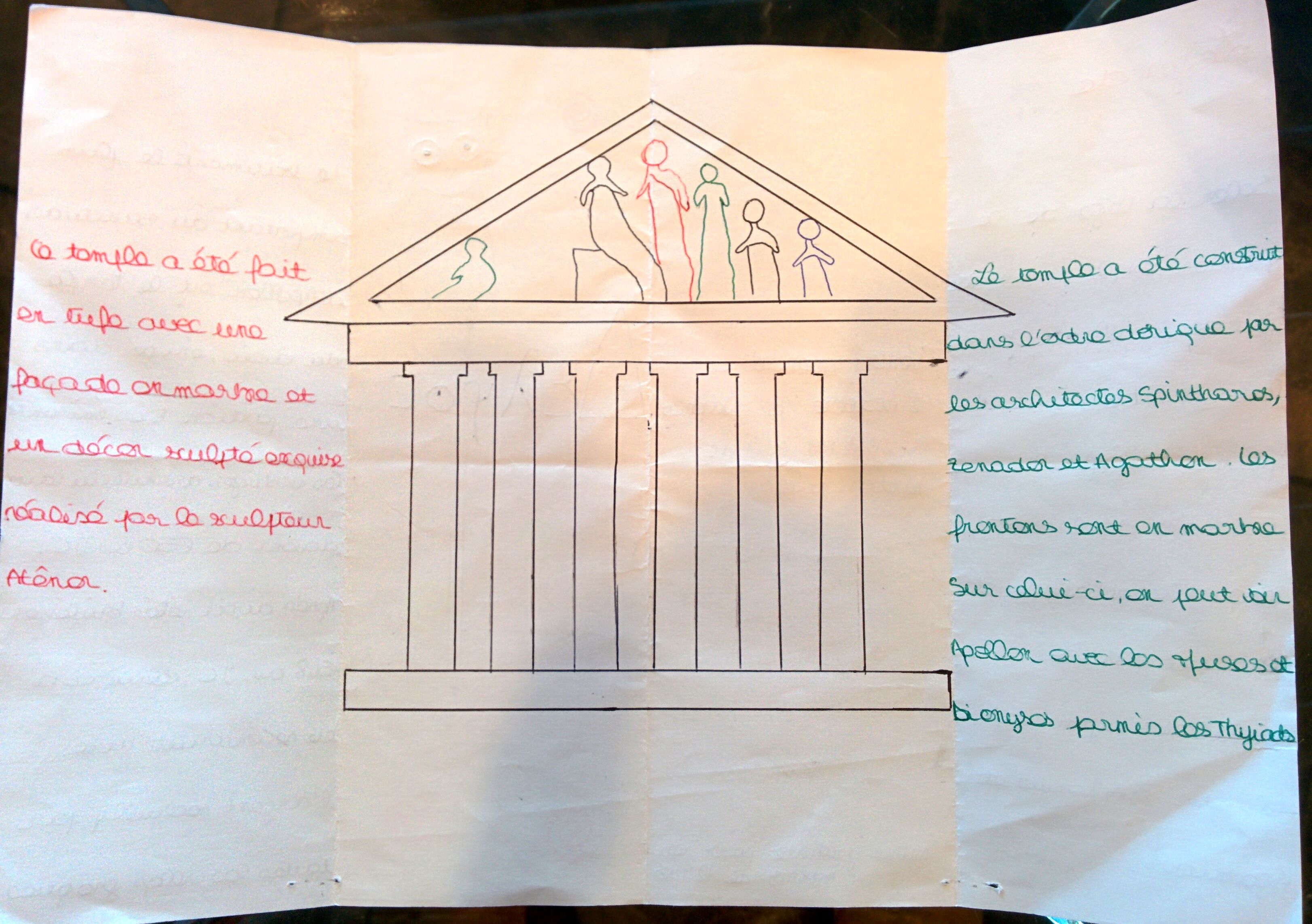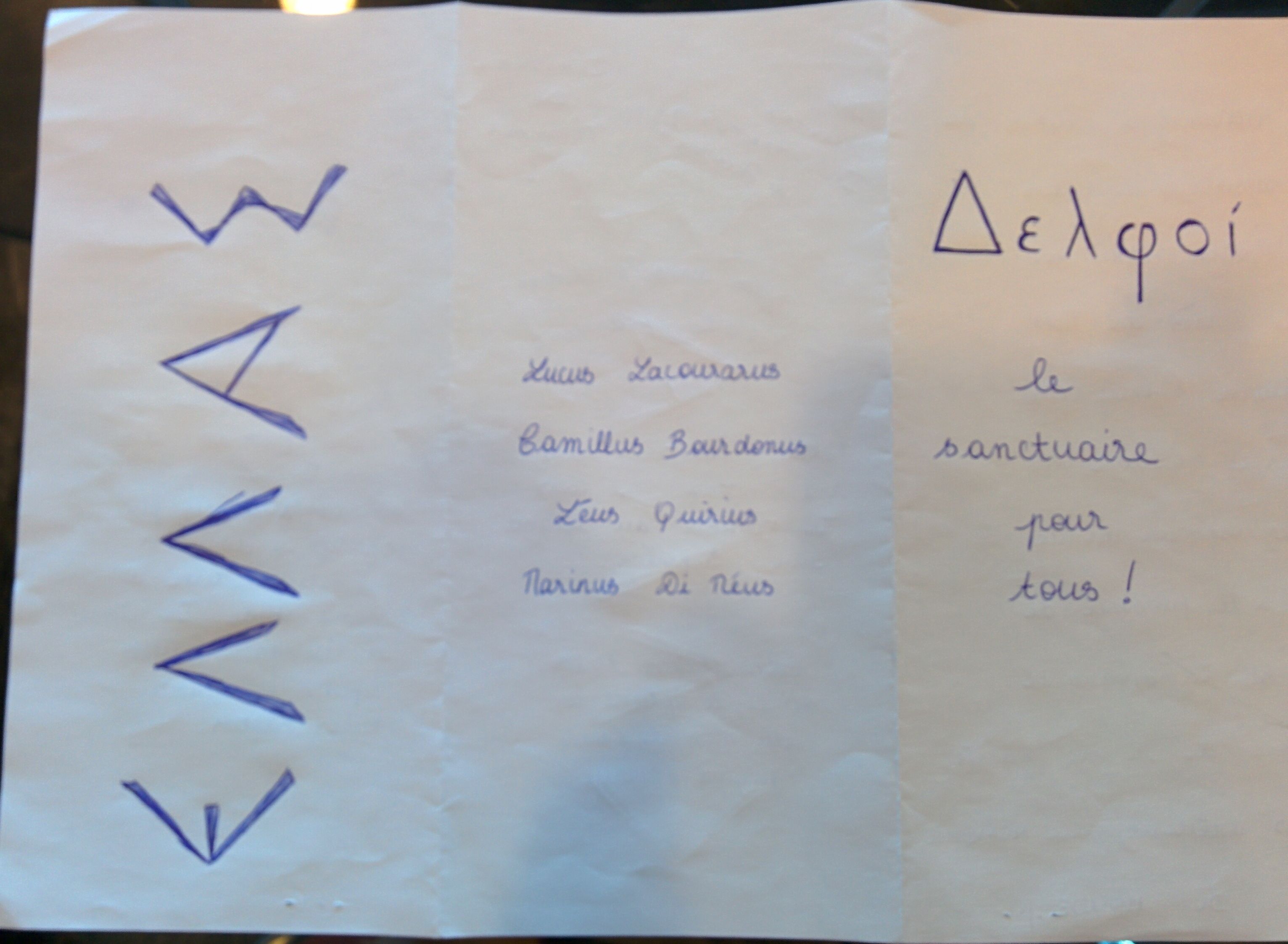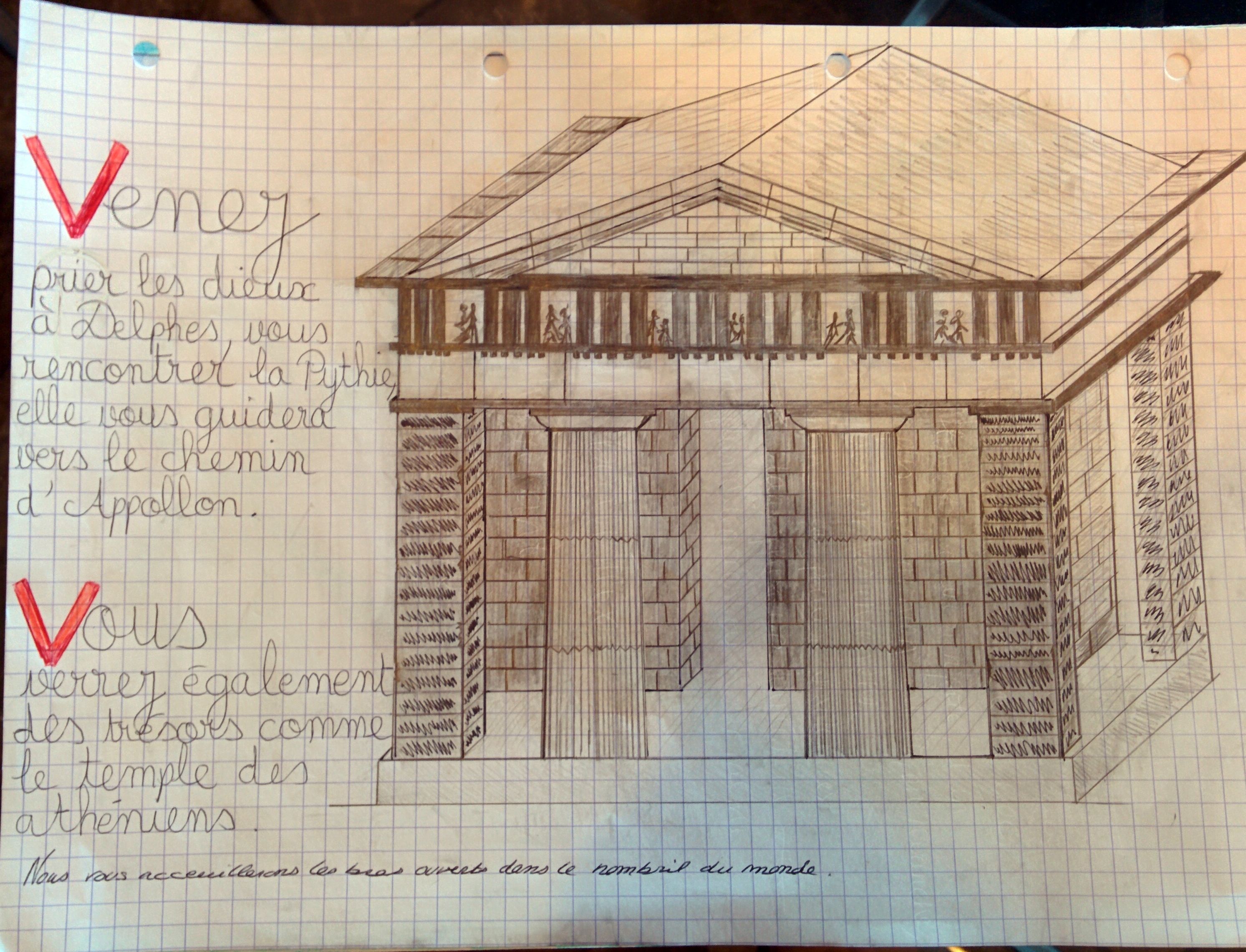La consigne donnée à nos élèves était simple : tout au long du séjour, nous avons vu des sites antiques qui se sont révélés pour la plupart être des sanctuaires. Ceux-ci ont fait l’objet de pèlerinage, ou de déplacement pour participer à des jeux ou à des manifestations dédiés aux dieux associés à chacun de ses sites. Comment choisir une destination dans l’antiquité ? Il fallait donc mettre ces sites en concurrence et chercher à attirer le visiteur antique... C’est le défi auquel ont répondu nos élèves sur le bateau, souvent avec humour... et avec les moyens du bord. Soyez donc indulgent sur la qualité finale, et pardonnez nous pour la qualité des photographies...