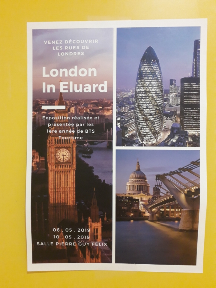Les étudiants de BTS-Tourisme ont depuis quelques mois préparé une exposition sur Londres. Grâce à celle-ci ils ont pu eux même travailler sur la capitale britannique et sont désormais prêts à vous la présenter. Ils auront le plaisir de vous rencontrer et de vous faire découvrir les différentes facettes de cette capitale cosmopolite en tant que guides tout au long de votre visite. Retrouvez tous les incontournables tels que Buckingham Palace ou encore Westminster, mais pas seulement : vous découvrirez des anecdotes sur les différents quartiers, peu connues de tous…
