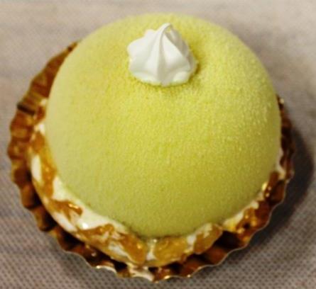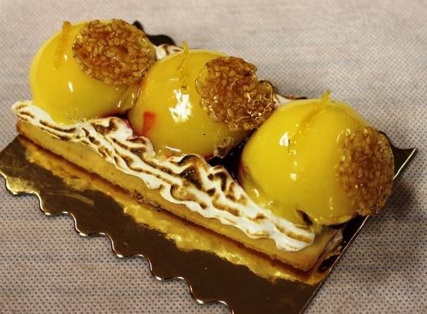 « Ambre orientale » avec une pâte sablée, crème citron vert, insert thé caramel, meringue suisse et éclats caramel