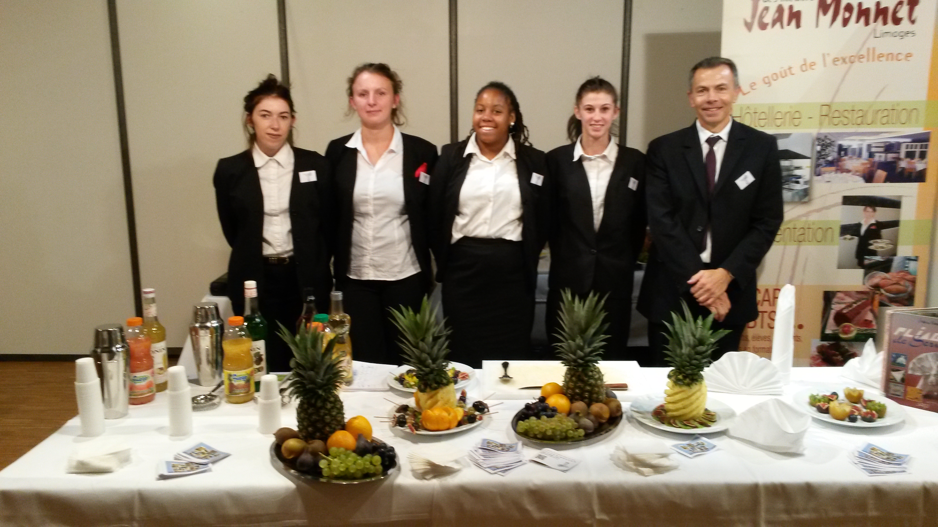 Les élèves serveurs de Terminale professionnelle "Service" ont participé à l’espace dédié au lycée Jean Monnet et ont réalisés des démonstrations de cocktails, des découpages de fruits et des pliages de serviettes.