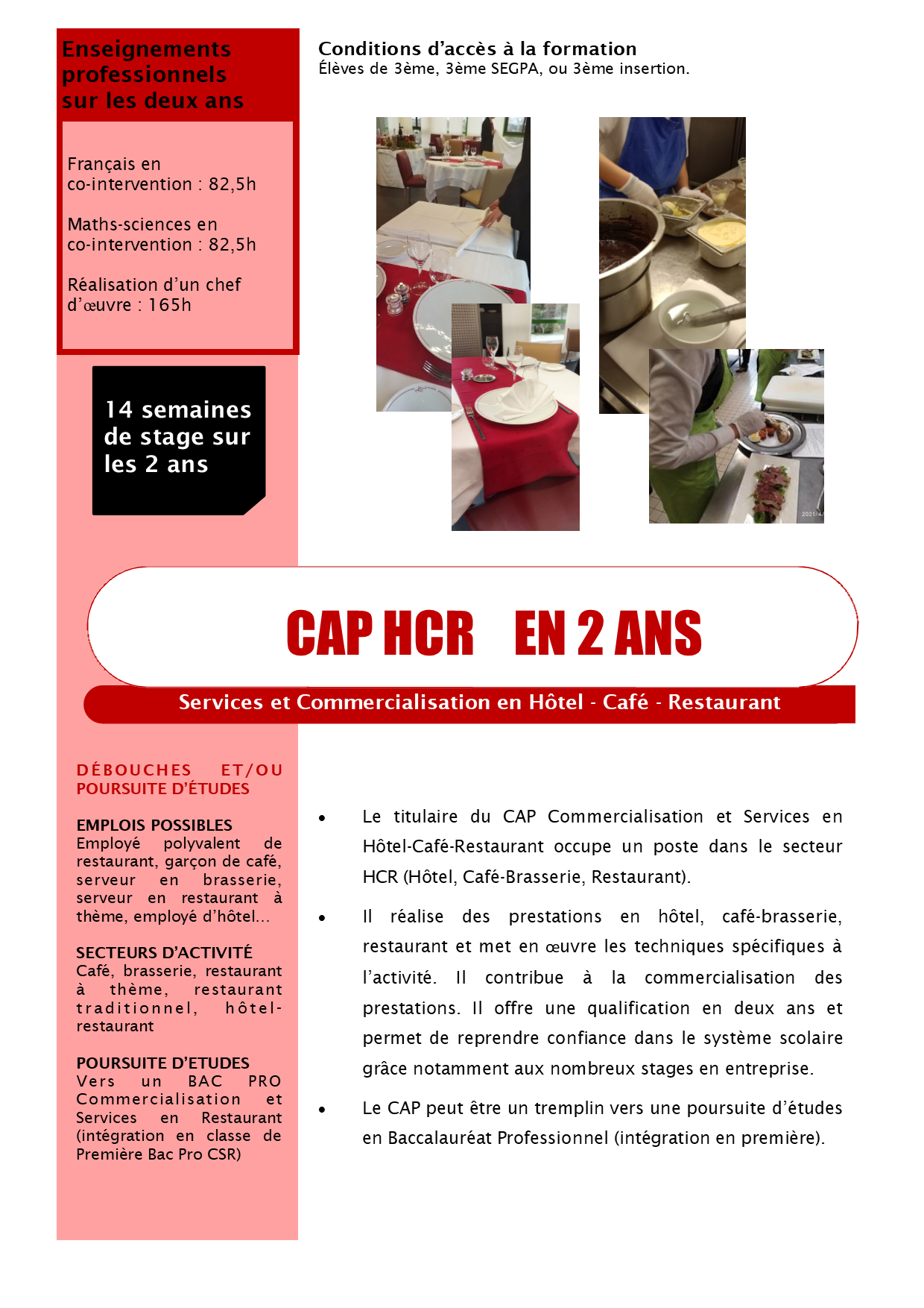 CAP "Services et Commercialisation en Hôtel-Café-Restaurant"(HCR) Les métiers de l’hôtellerie-restauration recrutent en continu. Un nouveau CAP, en apprentissage ou en scolarité classique est proposé au Lycée des Métiers Jean Monnet. Mode d’emploi. Chaud devant !