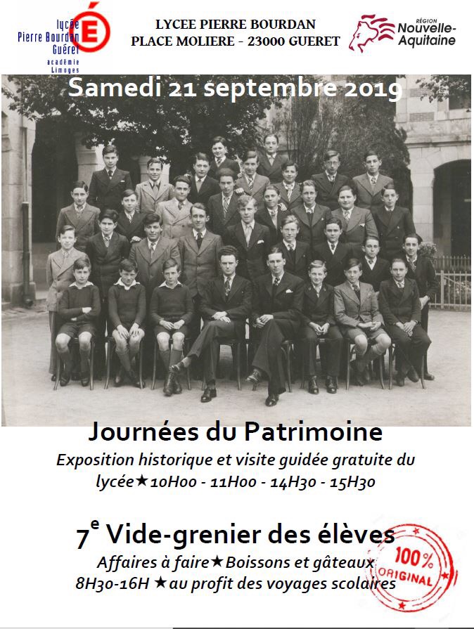 – pour les Journées européennes du Patrimoine, une exposition libre sur l’histoire du lycée est visible au CDI de l’établissement et quatre visites guidées sont organisées aux horaires précisés sur l’affiche ci-dessous.