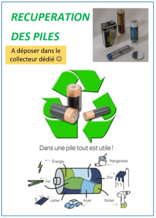 Vous pouvez déposer vos piles usagées et petites batteries dans le bac prévu à cet effet, sous les arcades, au niveau des bureaux de l’intendance. Vous pouvez aussi les déposer dans un des tiroirs à l’entrée de la vie scolaire, elles seront ensuite transférées dans le collecteur. Elles pourront ainsi être recyclées dans l’optique de la valorisation de leurs composants par l’organisme "Corepile".
