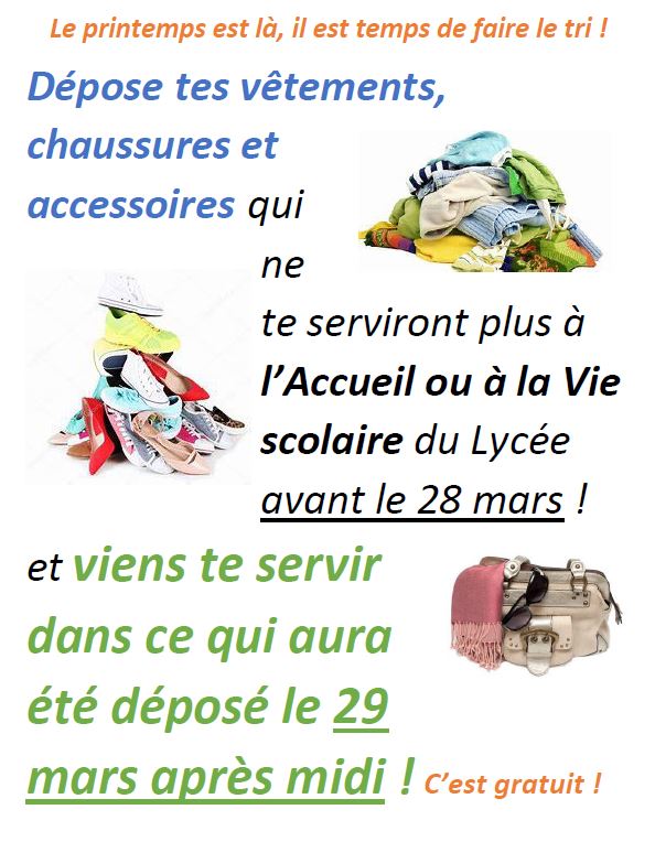 Au mois de mars, les lycéens et personnels de l’établissement ont été sollicités pour apporter leurs vêtements et accessoires dont ils n’avaient plus l’utilité chez eux . Cette récolte a ensuite été mise à disposition des élèves intéressés afin qu’ils puissent venir se servir parmi ce qui avait été déposé, permettant une première valorisation des dons réalisés en amont. Les vêtements et accessoires n’ayant pas trouvé preneur (environ 3 sacs de 100 L), ont été donnés à une association locale "Les Petites Mains du Limousin", centre de tri, collecte et recyclage de textiles, située sur la commune d’Aubusson.