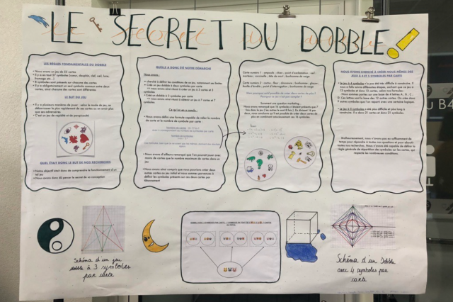 Au début de la semaine, après avoir constitué des groupes de travaux, nous avons choisi l’un des nombreux projets proposés par les chercheurs. Ceux-ci touchaient divers domaines, allant de l’informatique à la logique. Notre sujet s’articulait autour d’un jeu bien connu, celui du Dobble. Cela consistait, durant la semaine, non seulement à s’approprier notre sujet, très vague mais aussi à pousser ses limites, à se poser sans cesse de nouvelles questions sans toujours être capable d’y apporter des réponses.