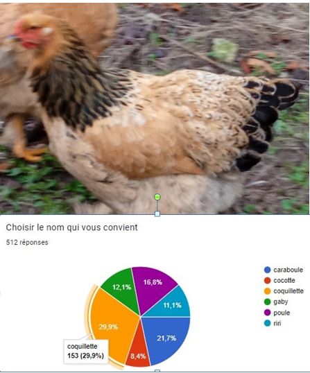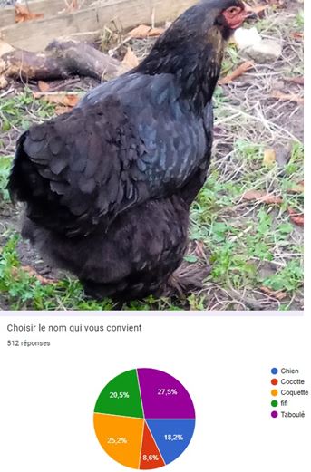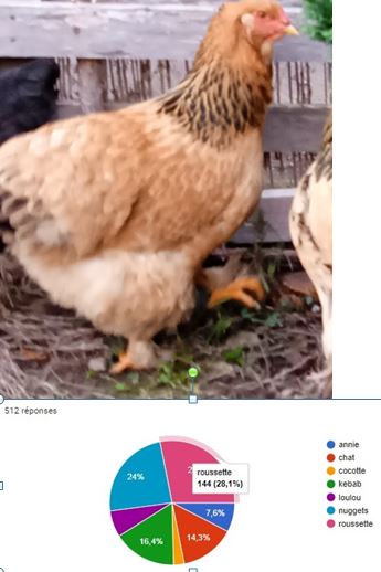 Les poules du lycée sont baptisées ! Après une délibération sur plus de 500 votes , le choix se porte sur trois noms : Roussette, Taboulé et Coquillette, .
