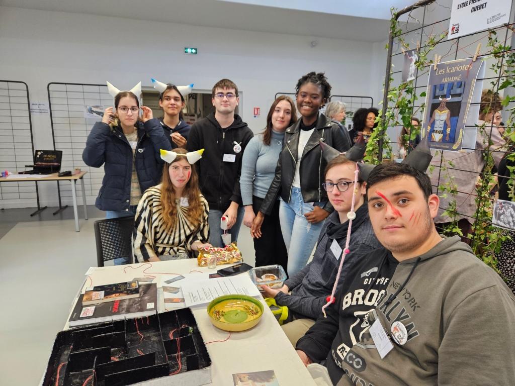Après avoir lu les 4 romans en lice pour le Prix cette année, nos 8 lycéens engagés dans cette action se sont réunis une fois par mois depuis le mois d’octobre pour préparer un stand autour du roman de Flora Boukri consacré à l’histoire d’Ariane et Thésée.