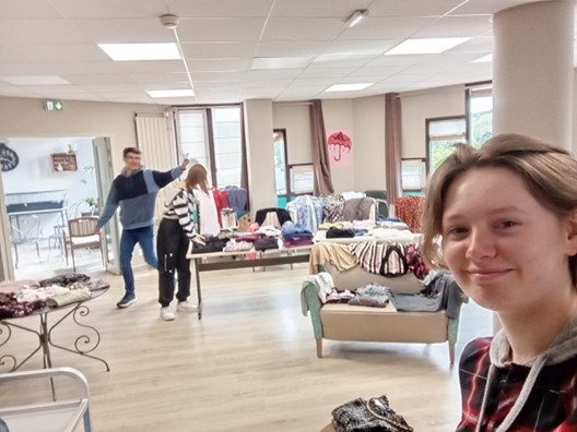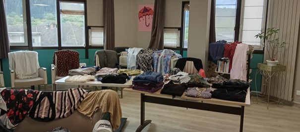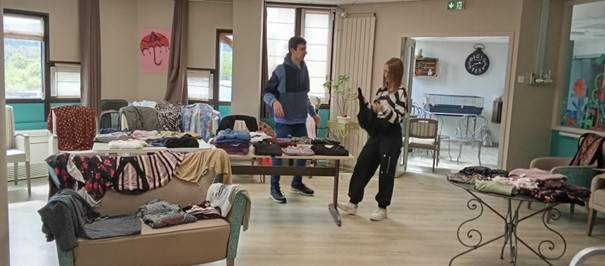 Après avoir été accueillis par une assistante de soins en gérontologie, nous avons disposé dans le salon de l’établissement les habits de seconde-main récoltés lors de la friperie d’été. Les résidents (une dizaine environ) allaient être surpris !