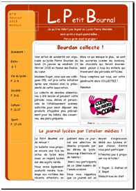 Créé en septembre 2012 par deux élèves de Terminale ES, Maëlys et Julie, le journal du Lycée Pierre Bourdan est conçu par les élèves avec l’aide des professeurs-documentalistes et d’une assistante d’éducation.