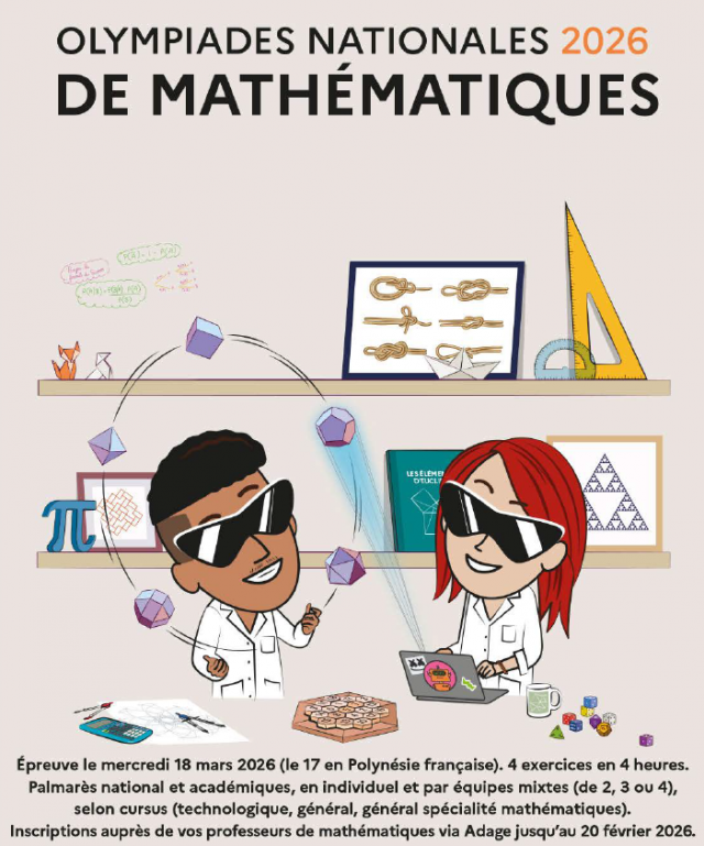 La 26e édition des Olympiades de mathématiques se déroulera dans la matinée du mercredi 18 mars 2026. Cette épreuve écrite de 4H est composée de quatre exercices qui s’appuient sur les programmes des classes de collège, de seconde générale et technologique et sur le programme commun des différentes classes de première. Elles sont ouvertes aux lycéens volontaires de première de toutes les séries.